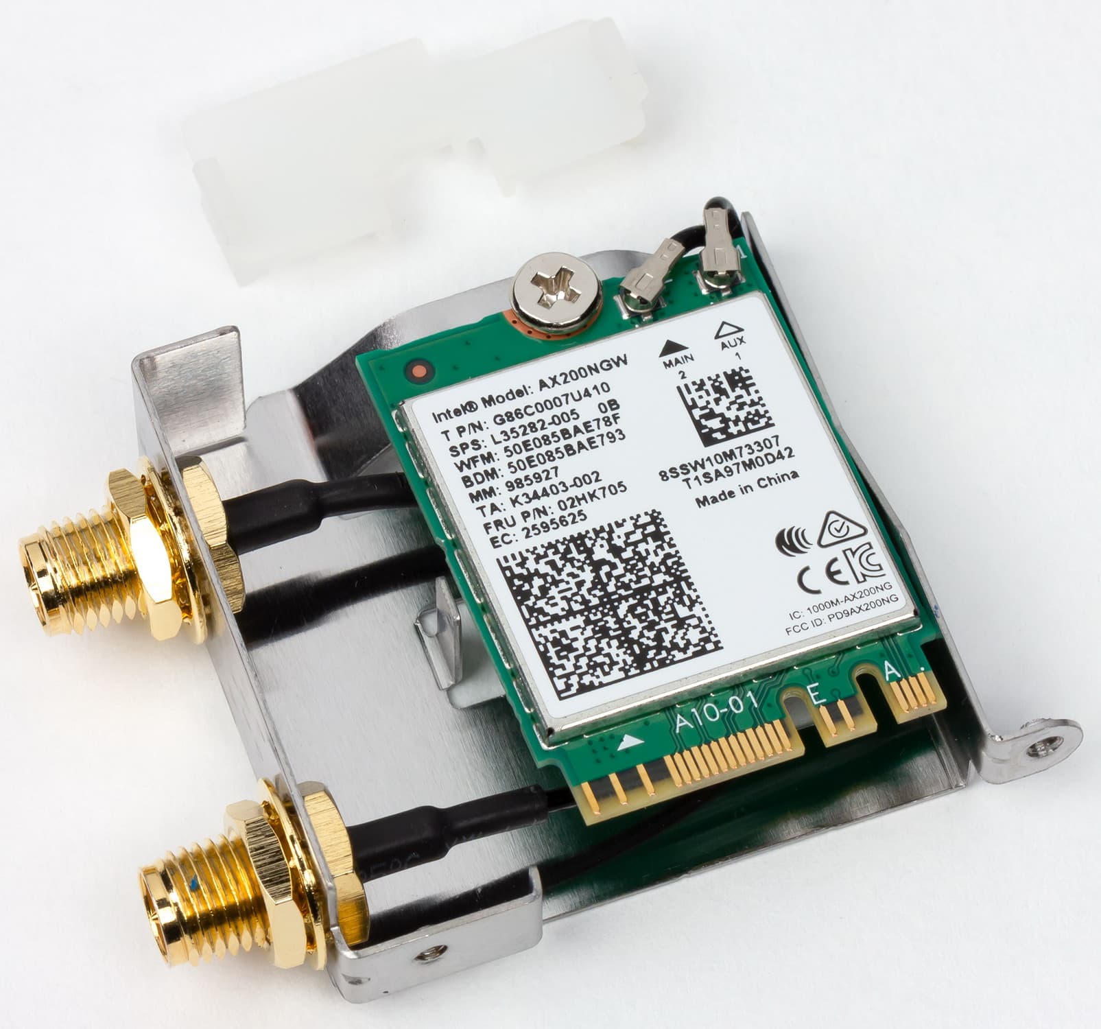 Имеется и комплексный беспроводной адаптер на контроллере Intel AX-200NGW, через который реализованы Wi-Fi 6 (802.11a/b/g/n/ac/ax) и Bluetooth 5.0. Он установлен в слот M.2 (E-key), и его разъемы для привинчивания выносных антенн выведены на заднюю панель.