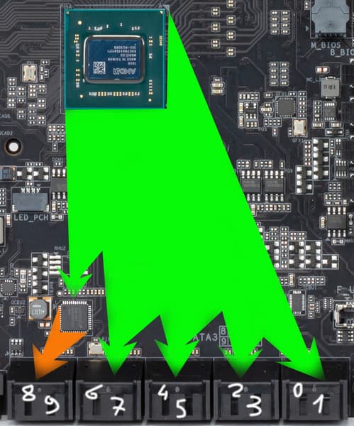 Далее, 48 линий идут на слоты PCI-Ex16 (тут уже каждый производитель материнских плат волен распределять самостоятельно) (остается свободных линий — 8). Оставшиеся линии могут пойти либо на 2 слота PCI-Ex4, либо на два порта M.2 с поддержкой NVMe, либо на 8 портов SATA, либо можно комбинировать порты и слоты (тут также производители матплат вольны) в рамках 8-ми линий PCI-E.