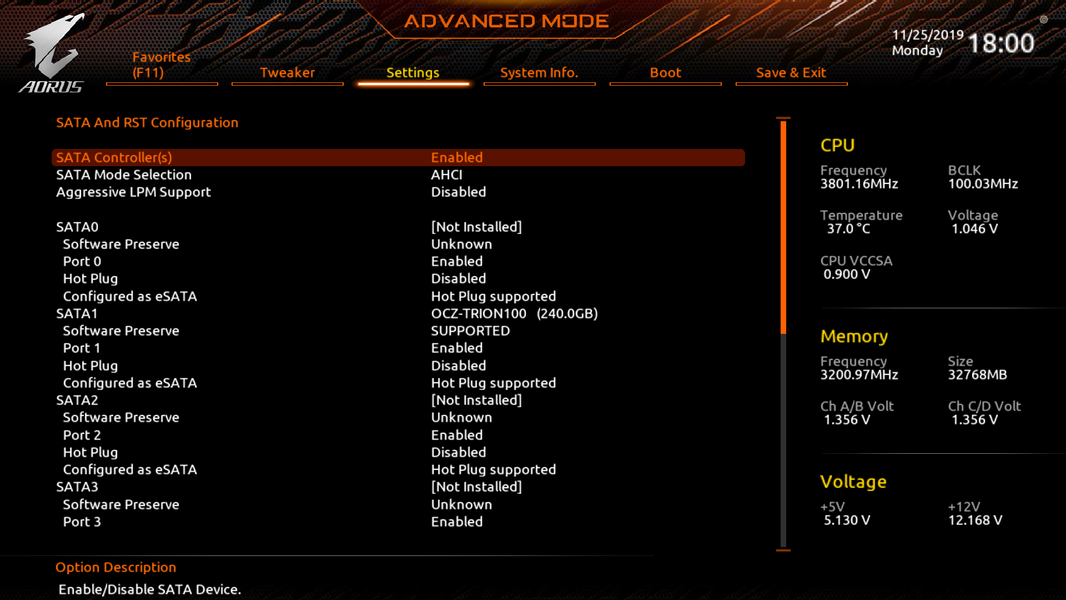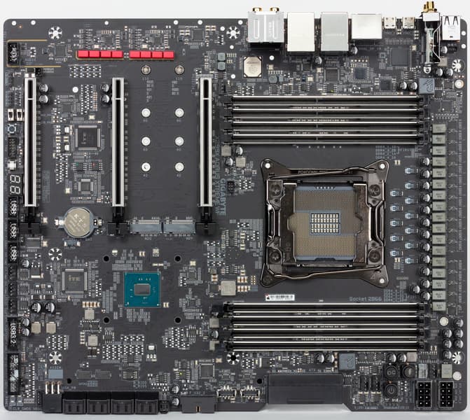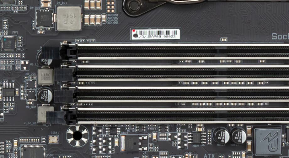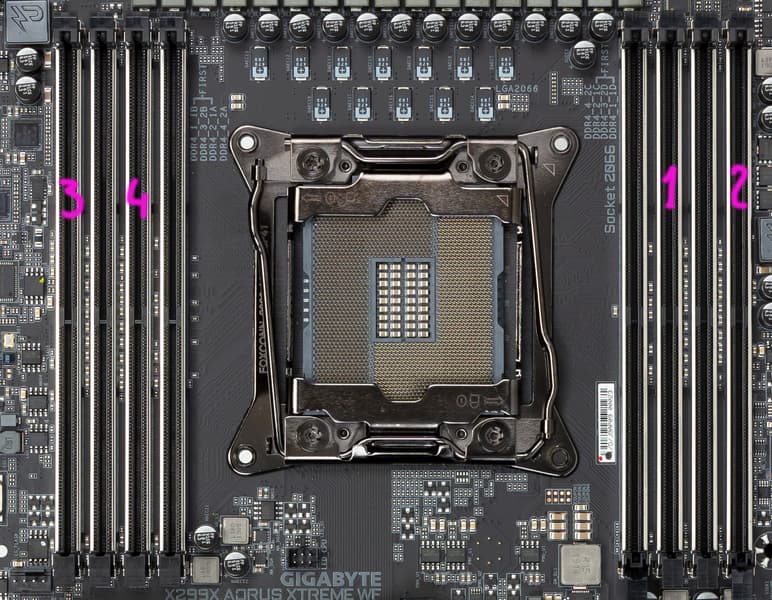 Для установки модулей памяти на плате Gigabyte имеется восемь DIMM-слотов. Плата поддерживает небуферизованную память DDR4 (non-EСС), а максимальный объем памяти составляет: 256 ГБ при использовании UDIMM последнего поколения по 32 ГБ совместно с процессорами Core i9 10xxxX/9хххХ; 128 ГБ в остальных случаях. Поддерживаются профили XMP.