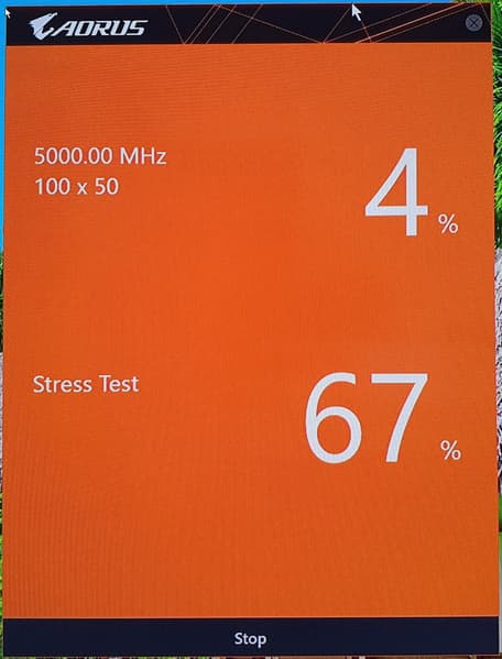 Я мучался сомнениями, нажимать Stop или нет. Вовремя успел сделать скриншот, потому что уже на 70% тестирования все зависло намертво. Слава Богу, что ничего не сломалось, система сбросила автоматически все параметры оверклокинга, и перезагрузка вернула все в нормальный вид без сбрасывания CMOS.