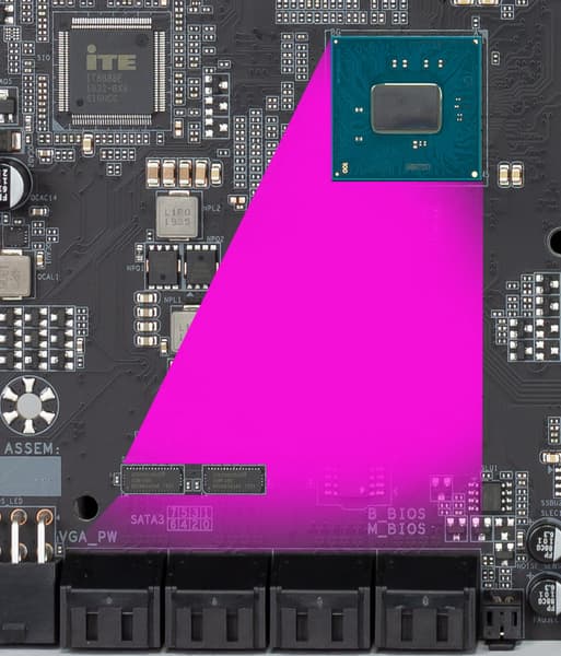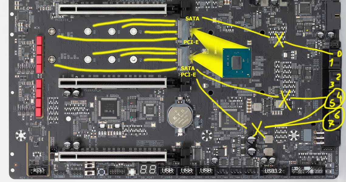 И даже в этом случае есть еще разделение ресурсов: если в нижний слот M.2 (M2Q) установить накопитель с интерфейсом SATA, то порты SATA 4 и 5 будут недоступны. А если в M2Q установить накопитель с PCI-E интерфейсом, то все 4 порта слева (4,5,6,7) станут недоступными. Ну и наоборот, если в порт SATA 4 или 5 подключить накопитель, то слот М2Q по сути станет недоступным.