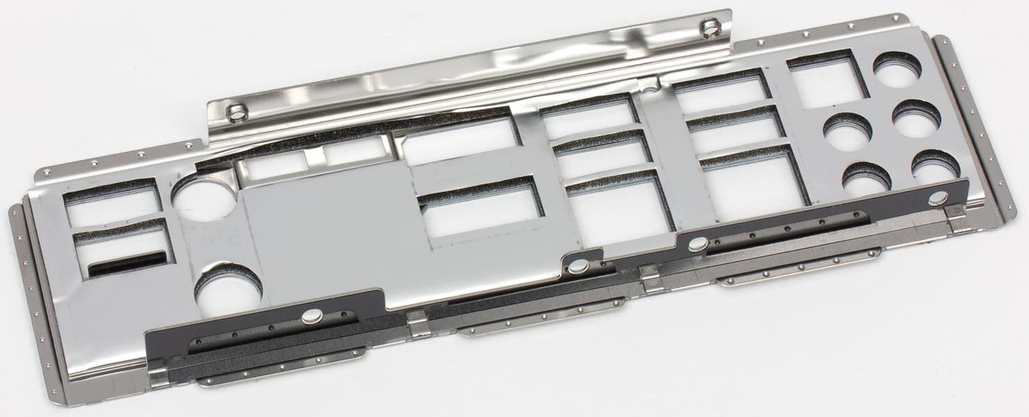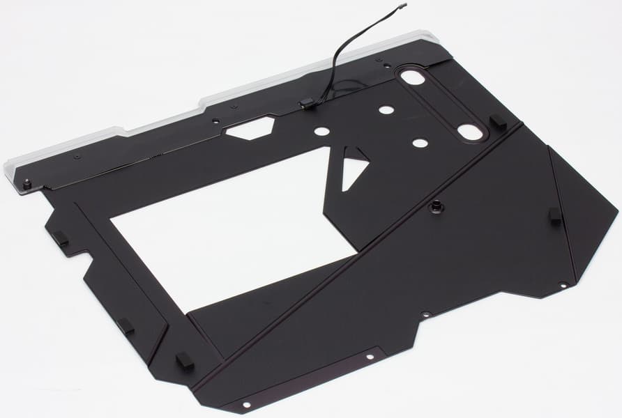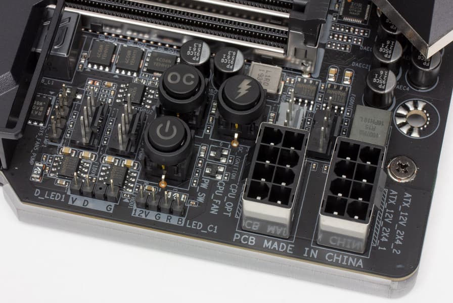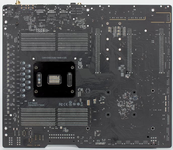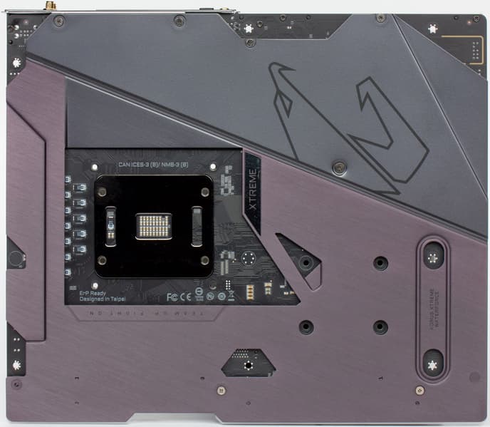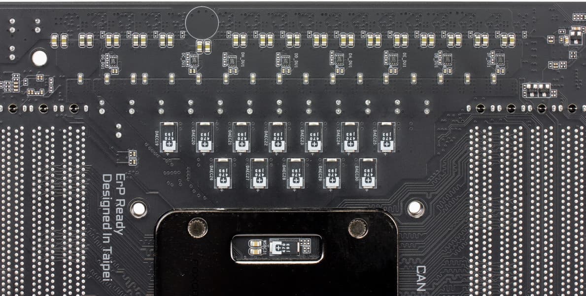 На оборотной стороне элементов мало, однако там присутствуют удвоители фаз питания и иная мелкая логика. Обработан текстолит хорошо: во всех точках пайки острые концы срезаны и обработаны. С той же стороны установлена пластина из алюминия с нанокарбоновым покрытием, которое нужно для предотвращения замыкания электроконтактов на PCB. Эта пластина обеспечивает жесткость материнской платы, а также на ней установлена подсветка бокового ребра платы.