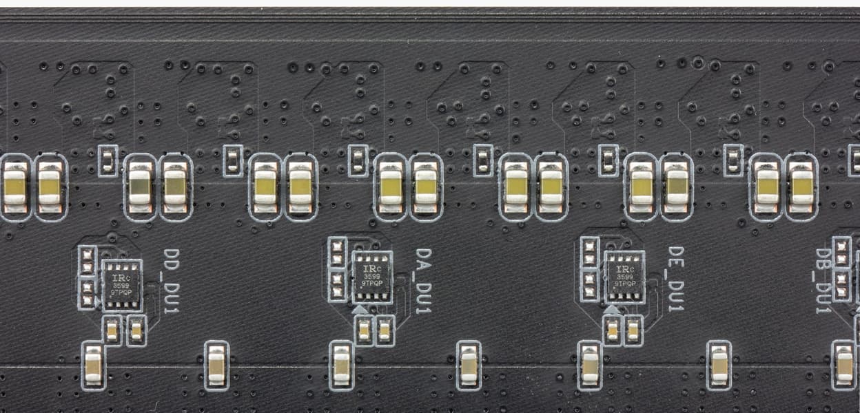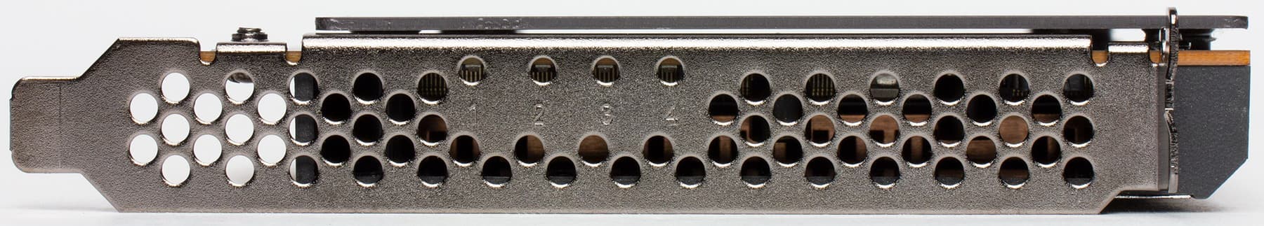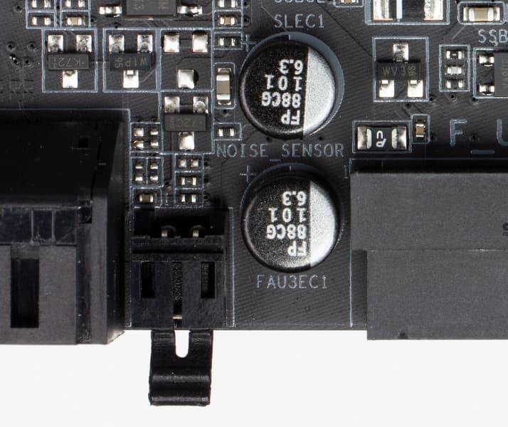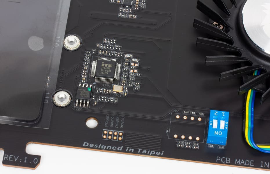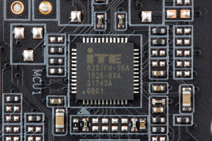 На оборотной стороне элементов мало, однако там присутствуют удвоители фаз питания и иная мелкая логика. Обработан текстолит хорошо: во всех точках пайки острые концы срезаны и обработаны. С той же стороны установлена пластина из алюминия с нанокарбоновым покрытием, которое нужно для предотвращения замыкания электроконтактов на PCB. Эта пластина обеспечивает жесткость материнской платы, а также на ней установлена подсветка бокового ребра платы.