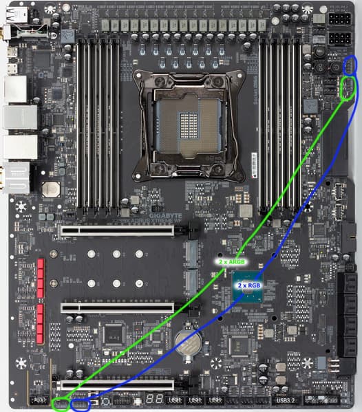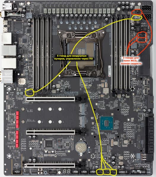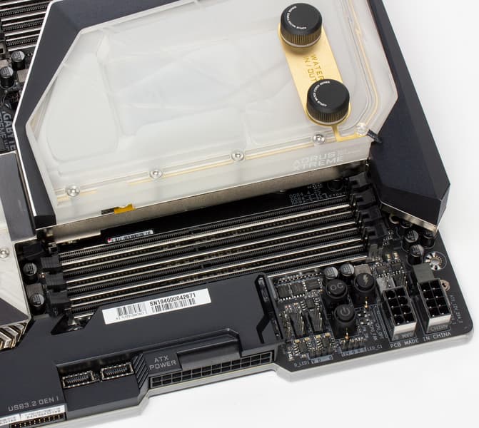 Слоты M.2 не имеют отдельных радиаторов для охлаждения, потому что общий водоблок покрывает и их. Оба слота можно использовать под Intel Optane Memory (но только при условии использования Core i9 10xxxX), и разумеется, организовать RAID-массивы.