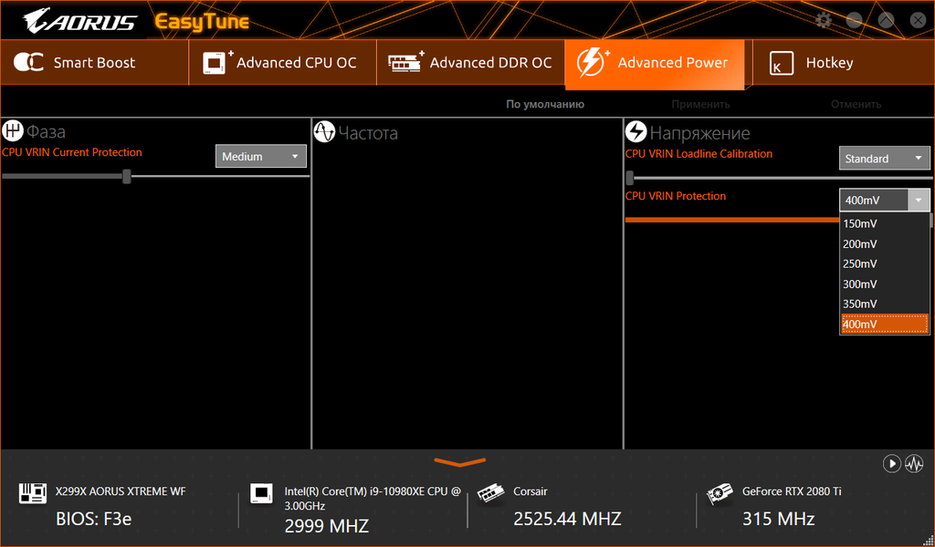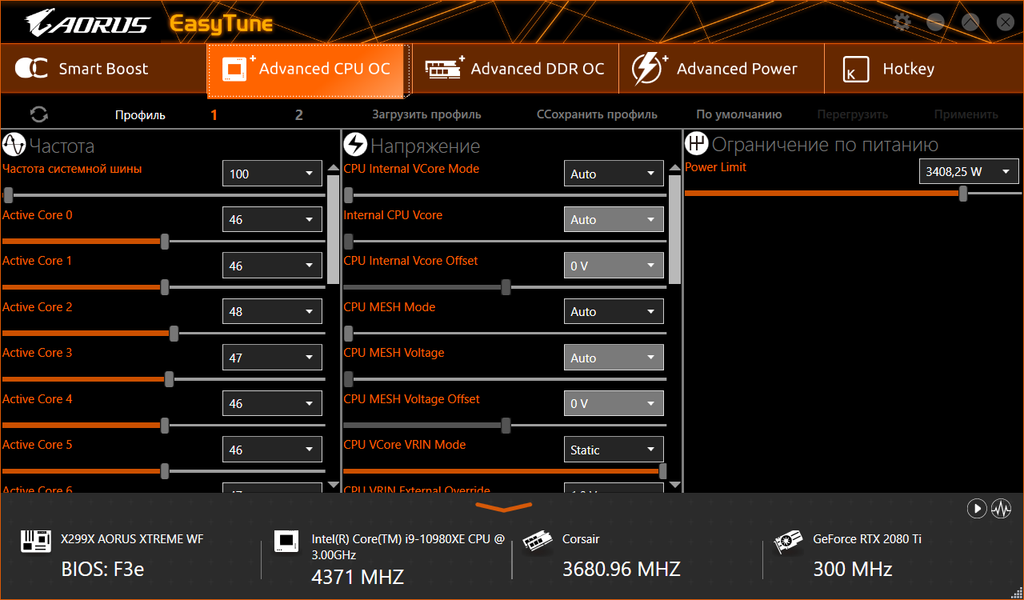 То есть суммарно система питания способна пропустить через себя колоссальную нагрузку (хватит на 4 топовых процессора). Учитывая, что данная материнская плата рассчитана на оверклокинг, как-то выглядит странной система удвоения фаз питания. Почему нельзя установить полноценную схему — осталось за кадром. Вероятно преемственность дизайна с другой материнки, либо просто уже себестоимость платы зашкалила бы все пределы. Тем не менее, приличная регулировка питания, востребованная энтузиастами/оверклокерами, в данном случае все равно имеется. Плюс огромный резерв по нагрузке обеспечит стабильность и относительно невысокие температуры VRM даже при использовании совместно с самыми «прожорливыми» процессорами типа i9-10980XE.