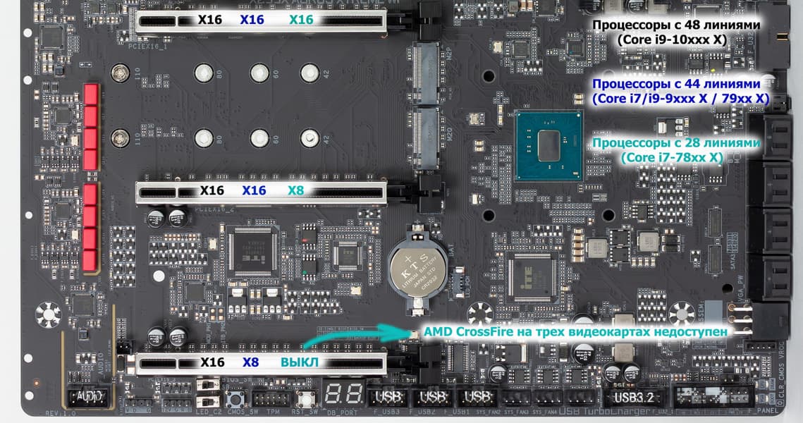 А если уже кому-то очень захочется заполучить комбинацию из трех видеокарт (на сегодня это актуально только для технологии AMD CrossFireX), то владельцы самых последних i9-10xxxX вообще не заметят проблем: все три слота по-прежнему будут иметь х16. Владельцам CPU c 44 линиями придется смириться с тем, что третий PCI-Ex16 будет переведен в х8 (хотя вряд ли кто это почувствует). А вот комбинация из трех видеокарт владельцам i7-78xxX недоступна.