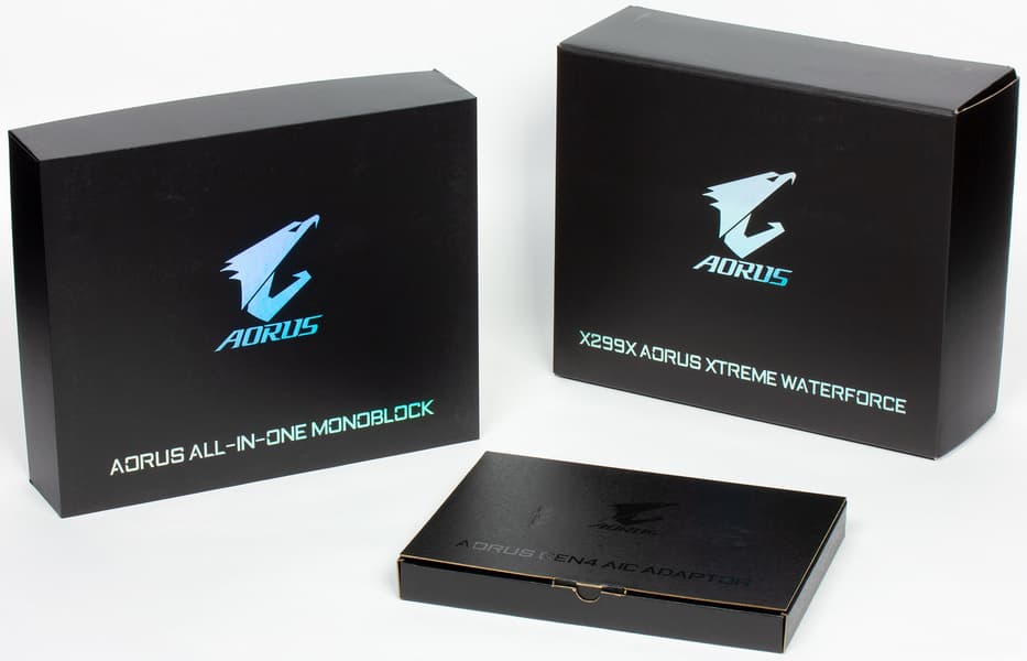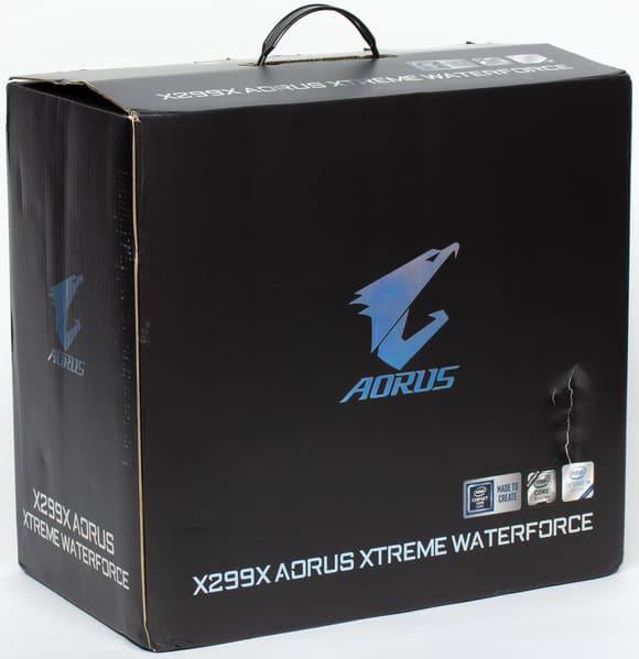 Gigabyte X299X Aorus Xtreme Waterforce поставляется в огромной и толстой коробке с характерным для серии Aorus дизайном (логотип переливается, что всегда присуще только топовым продуктам этой компании).