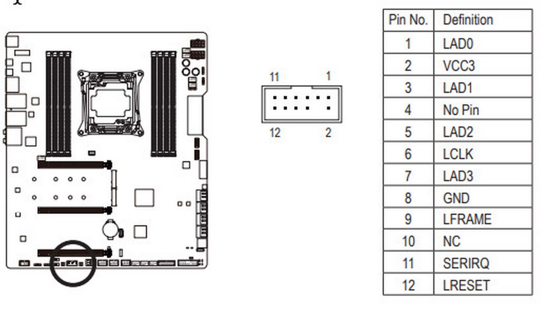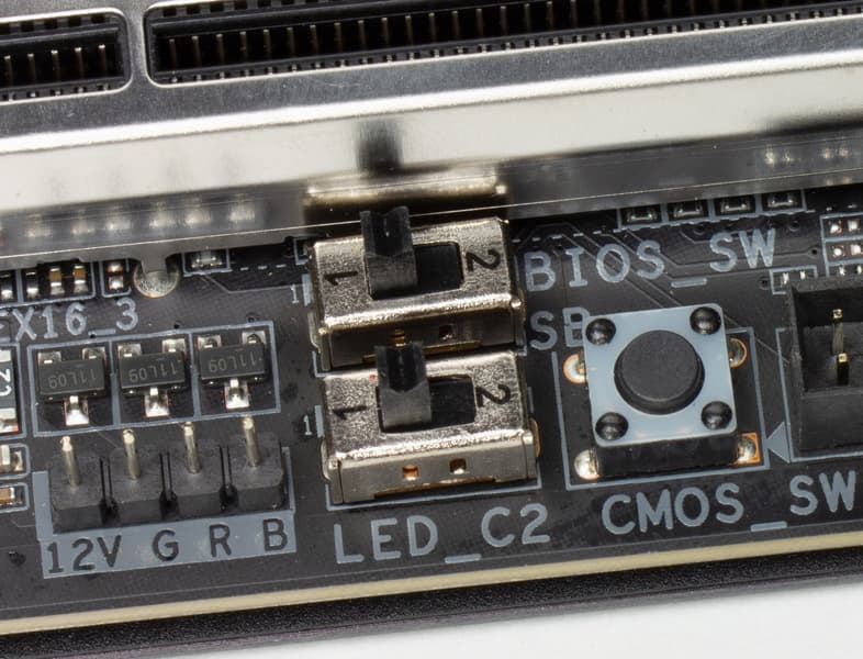 - Переключатель: если CPU с 48 линиями PCI-E, то слот PCI-Ex16_3 получает 16 линий; если CPU c 44 линиями PCI-E, то слот PCI-Ex16_3 получает 8 линий; в противном случае (CPU с 28 линиями PCI-E) — отключен.