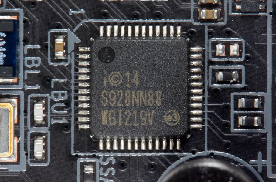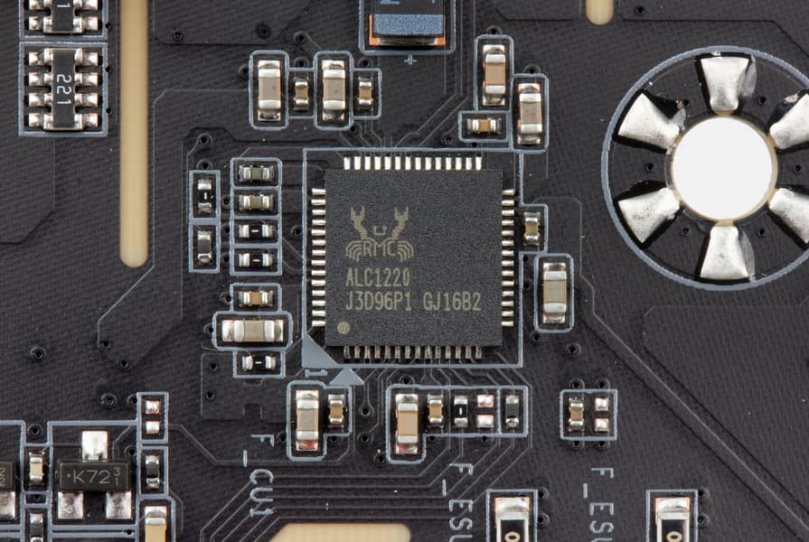 Собственно, два комплекта размещены для того, чтобы выводы развести: один комплект выводит звук на заднюю панель, а второй — на внутренний разъем для подключения к корпусным гнездам. И сделано для того, чтобы можно было иметь всегда подключенные и внешние динамики, и наушники, и не беспокоиться по перетыкиванию: просто в настройках Windows выбирать нужный аудиокодек для вывода звука, и все.