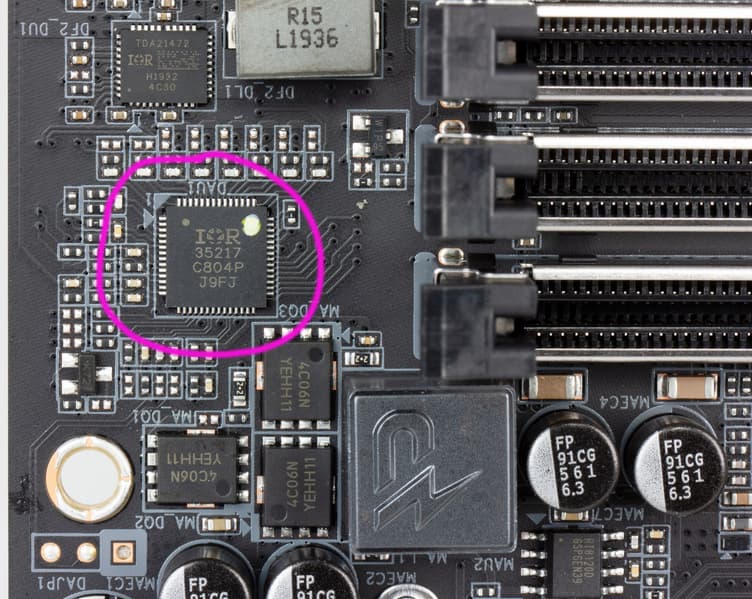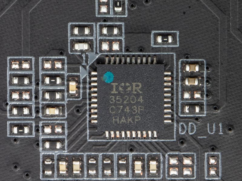 ШИМ-контроллером на все 6 фаз тут служит IR35204 того же производителя.