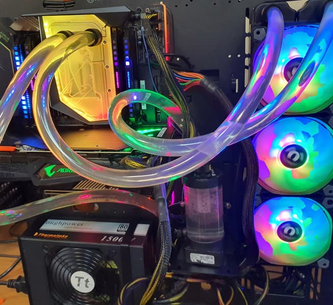 Стоит отметить, что слоты PCI-E и слоты для модулей памяти армированы. Несмотря на то, что в системе питания предусмотрено удвоение фаз, она способна обеспечить работу любых совместимых процессоров с большим запасом стабильности. Плата укомплектована специальным адаптером для установки до 6 M.2-накопителей, причем некоторые из них можно объединить в очень скоростные RAID-массивы. Аппаратная поддержка Intel Thunderbolt 3.0 может привлечь тех, кому требуется вывод изображения на много приемников либо в очень высоком разрешении. Те же два Thunderbolt-порта можно использовать и как скоростные порты USB 3.2 Gen2 Type-C. Плата предлагает 8 разъемов для подключения управляемых вентиляторов любых систем охлаждения, а также широкие возможности для подключения дополнительных ARGB/RGB-устройств. В комплекте поставки идет Fan Commander, дающий возможность увеличить количество разъемов для подключения вентиляторов. Впрочем, для данной платы это не слишком актуально, ведь ее основная «изюминка» — это водоблок, то есть комплексное охлаждение всех греющихся частей единым массивным блоком с участием ЖСО, которая приобретается отдельно. На примере кастомной процессорной ЖСО Thermaltake мы смогли убедиться, что подобные системы работают очень тихо, и в целом, при наличии современного БП, способного выдавать огромную мощность без включения вентилятора, получается, что шум у такого ПК будет только от видеокарт.