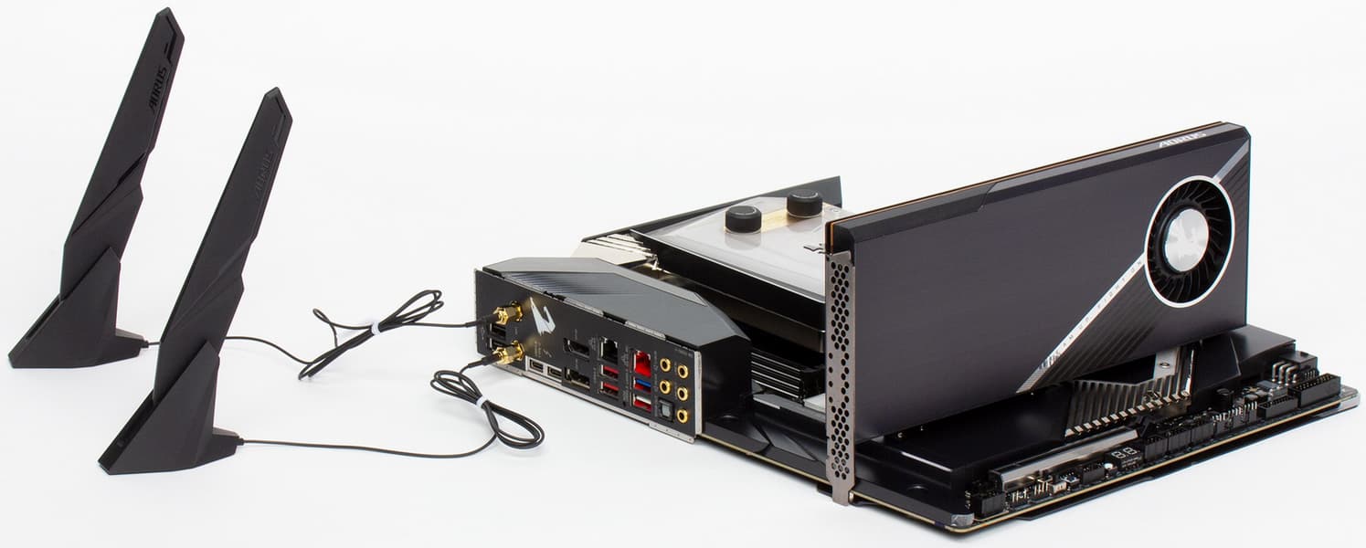 Уже разбирая все коробки и отсеки, можно понять, что комплект поставки — ну очень обширный. Ну традиционные элементы типа руководства пользователя, кабелей SATA, винтиков для монтажа модулей M.2, носителя ПО, — мы не считаем, это уже привычно. Еще имеются выносные антенны с подставками для беспроводных соединений, разветвители для подключения подсветок, фирменный адаптер G-Connector, провода с термодатчиками, Aorus Gen4 AIC Adaptor, Fan Commander со своими кабелями, моноблок (водоблок) для охлаждения, термопрокладка, шприц с термопастой, бонусные стяжки и наклейки.