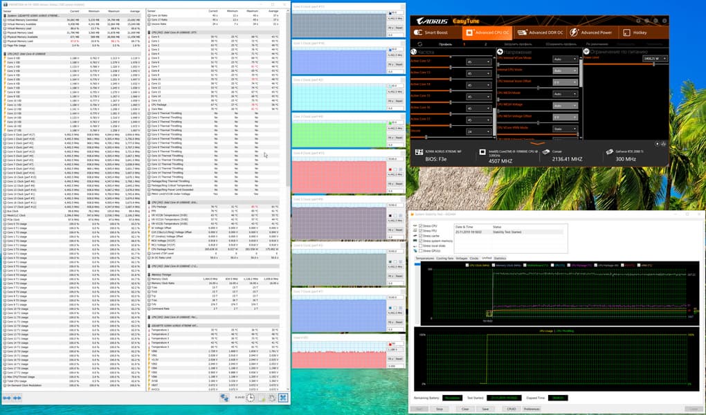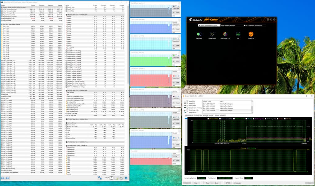 Легкий разгон установил частоту в 3.8 ГГц по всем ядрам, но временами эпизодически были «подпрыгивания» до 4.5 ГГц по каждому ядру (разумеется, одновременно такую частоту держали на более 1-2 ядра). Все параметры работы системы в норме, это хорошо видно из мониторинга.