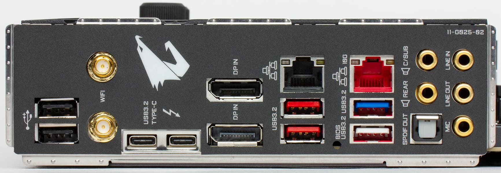 | Разъемы на задней панели | 2 × USB 3.2 Gen2 (Type-C) 2 × USB 3.2 Gen2 (Type-A) 2 × USB 3.2 Gen1 (Type-A) 2 × USB 2.0 (Type-A) 2 × RJ-45 5 аудиоразъемов типа миниджек 1 × S/PDIF (оптический, выход) 2 антенных разъема 2 × Display Port |