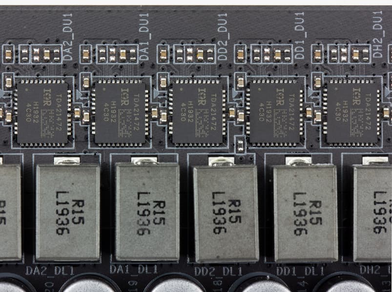 Каждый канал «псевдофазы» имеет суперферритовую катушку и MOSFET IOR TDA21472 на 70 A того же Infineon.