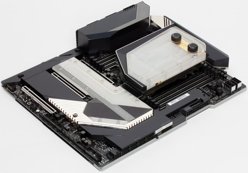 Как мы видим, водоблок охватывает чипсет, слоты M.2, процессорное гнездо и силовые преобразователи.
