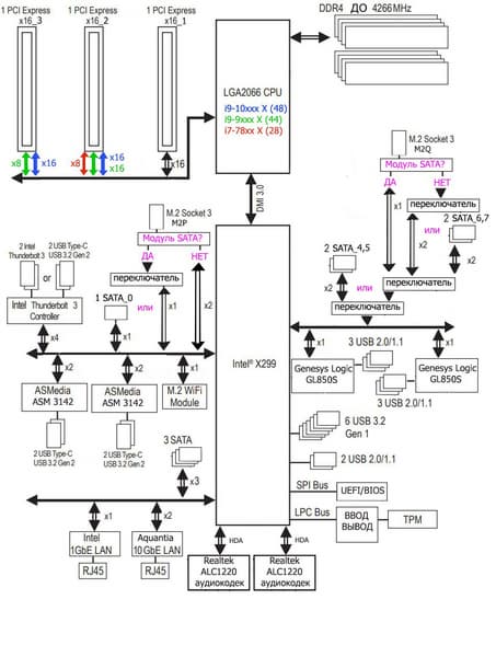 Появление корректировки в блок-схеме Х299 (желтым цветом) обязано обновлению процессоров (а не чипсета): Core i9-10xxxX имеют уже 48 линий PCI-E, а также способны работать с более быстрой памятью (хотя 2933 МГц — это официально установленная Intel граница, производители вольны в каждом случае ставить лимиты по частотам выше, а также применять XMP-профили модулей памяти).