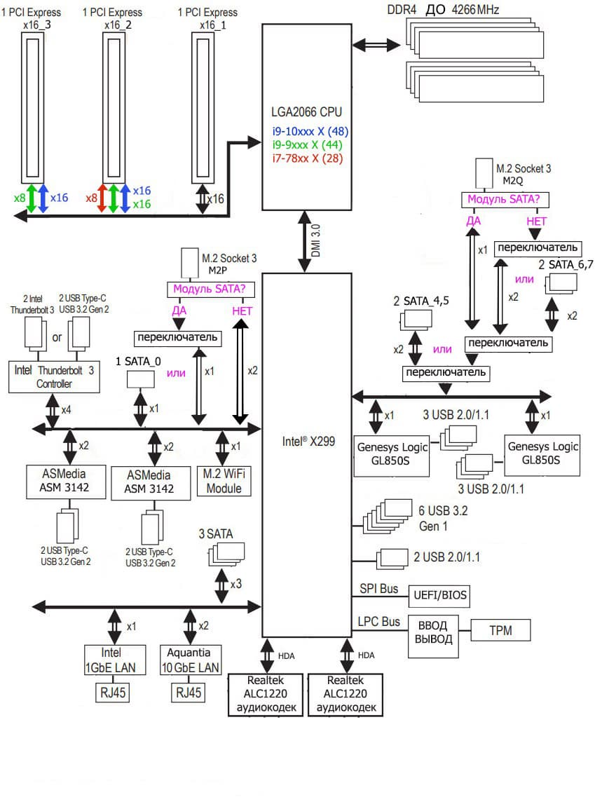 Процессоры Intel Core i9-7xxxX/9xxxX/10xxxX (совместимые с сокетом LGA2066 и поддерживаемые Х299) имеют 28 (Core 78xxX) или 44 (Core 79xxX/99xxX) или 48 (Core 10xxxX) линий ввода-вывода (включая PCI-E 3.0), не имеют USB и SATA портов. При этом взаимодействие с X299 идет по особому каналу Digital Media Interface 3.0 (DMI 3.0), и линии PCI-E на это не расходуются. Все PCI-E линии процессора идут на слоты расширения PCI-E (в отдельных случаях и на порты M.2).