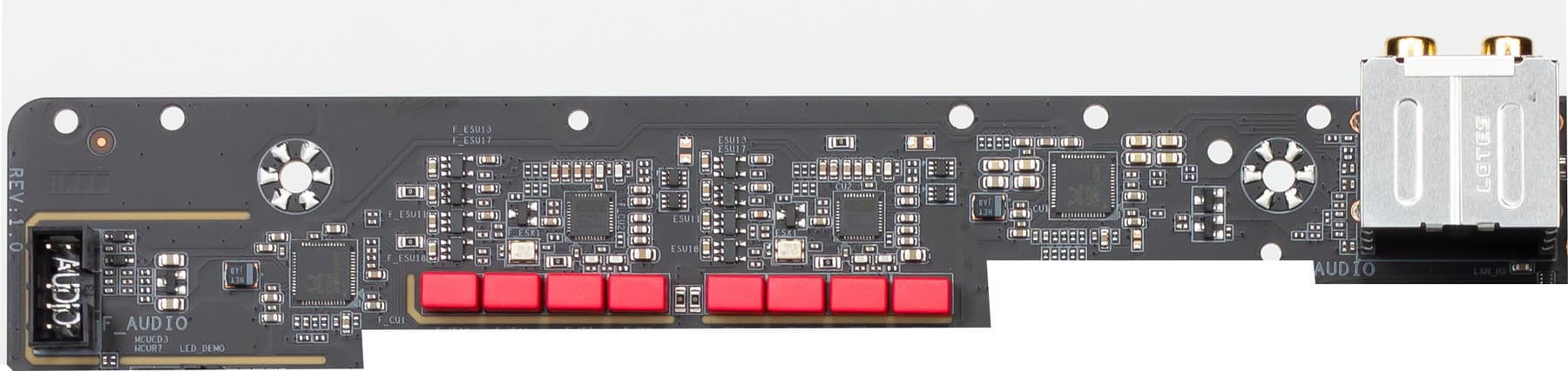 Аудиотракт вынесен на угловую часть платы, как обычно левый и правый каналы усилителя разведены по разным слоям печатной платы. Все аудиоразъемы имеют позолоченное покрытие, однако не сохранена привычная цветовая окраска разъемов (которая неплохо помогает подключать нужные штекеры без вглядывания в их наименование).