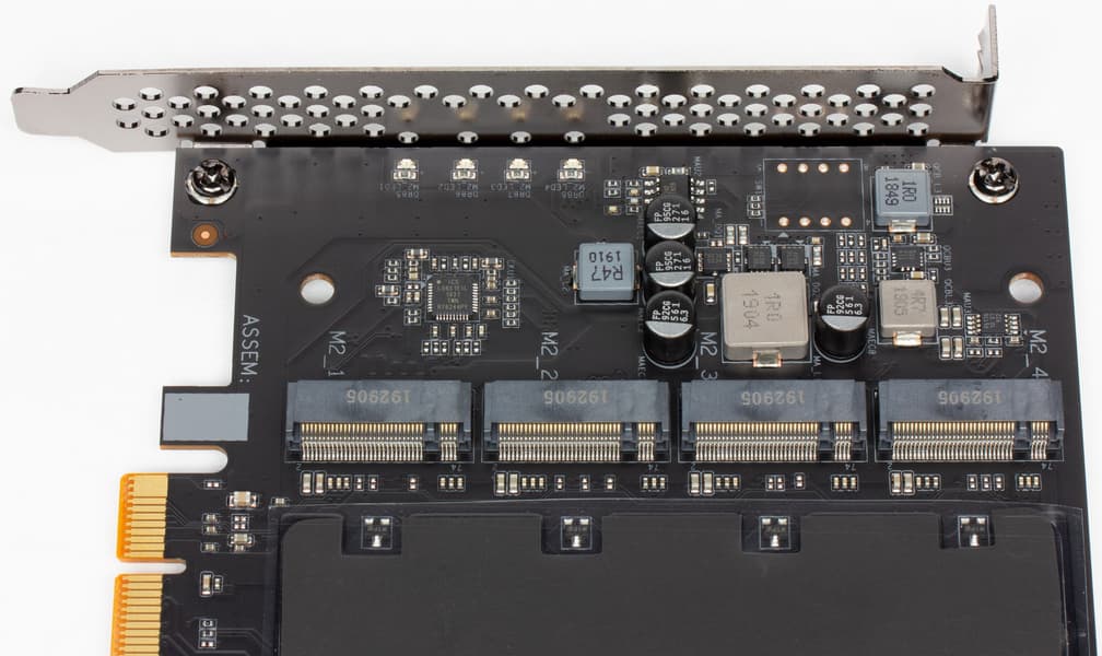 Поэтому с материнской платой поставляется особая карта (она уже поддерживает интерфейс PCI-E 4.0, но в данном случае будет работать в версии 3.0), способная вместить на себе аж 4 модуля форм-фактора M.2.