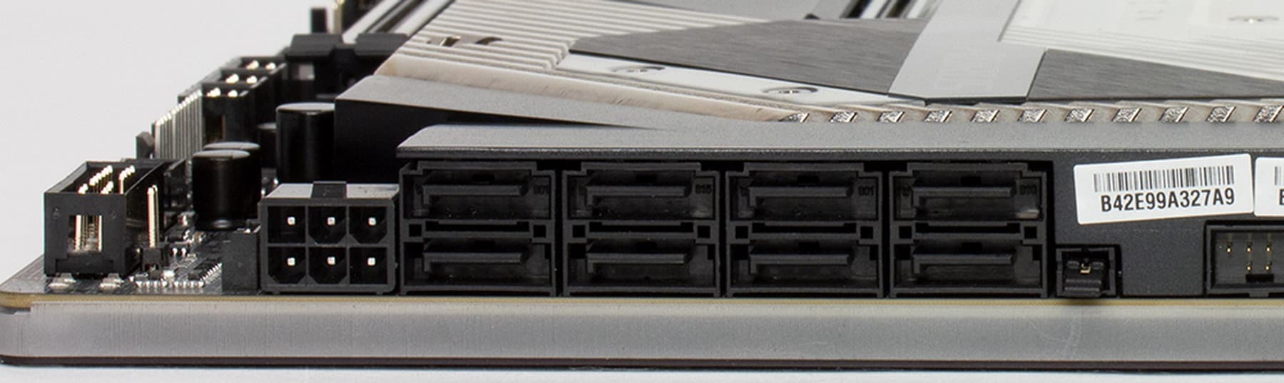 Всего у платы 8 разъемов Serial ATA 6 Гбит/с + 2 слота для накопителей в форм-факторе M.2. (Еще один слот M.2 расположен у задней панели и занят контроллером беспроводных сетей Wi-Fi/Bluetooth.). Все 8 портов реализованы через чипсет X299.