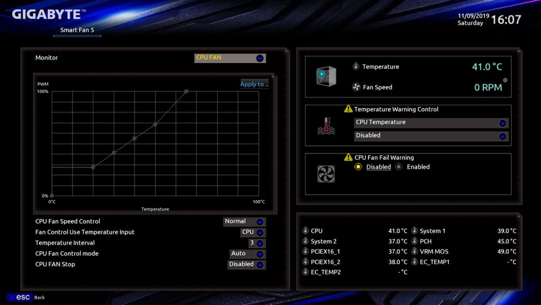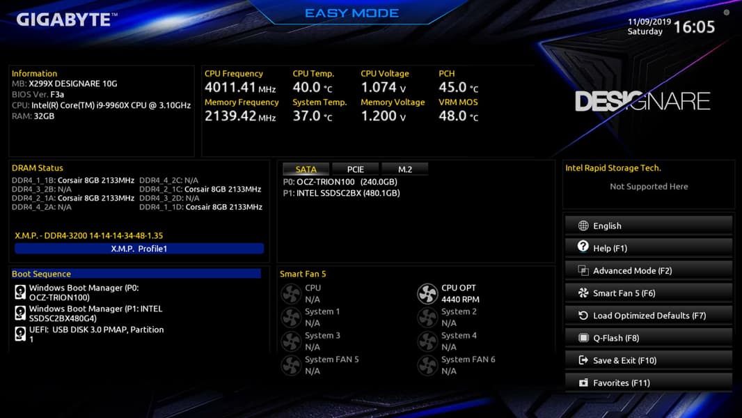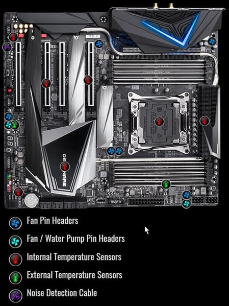 Также Gigabyte X299X Designare 10G обладает целой россыпью встроенных термодатчиков (плюс пара гнезд для подключения внешних). Управление всем этим богатством возложено на утилиту SmartFan 5.0, а также реализовано управление в настройках UEFI/BIOS.