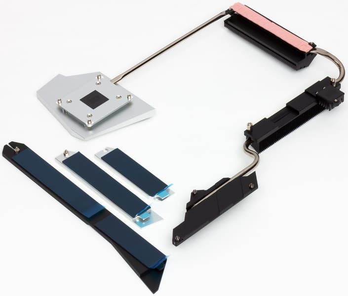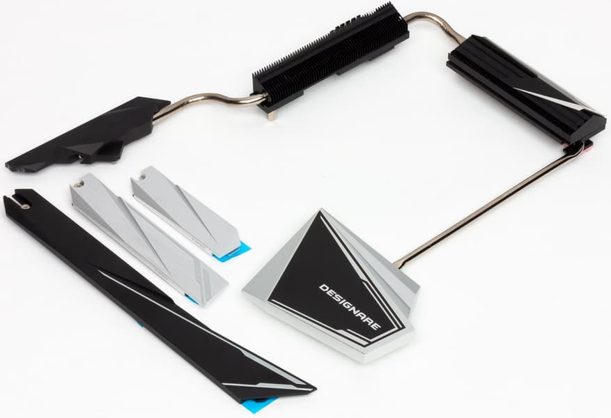 Для модулей M.2, как я уже выше отмечал, есть свои три радиатора с термоинтерфейсами. Они не крепятся к большому чипсетному радиатору (просто смотрятся как продолжение общего дизайна), поэтому не принимают участие в общей схеме охлаждения.
