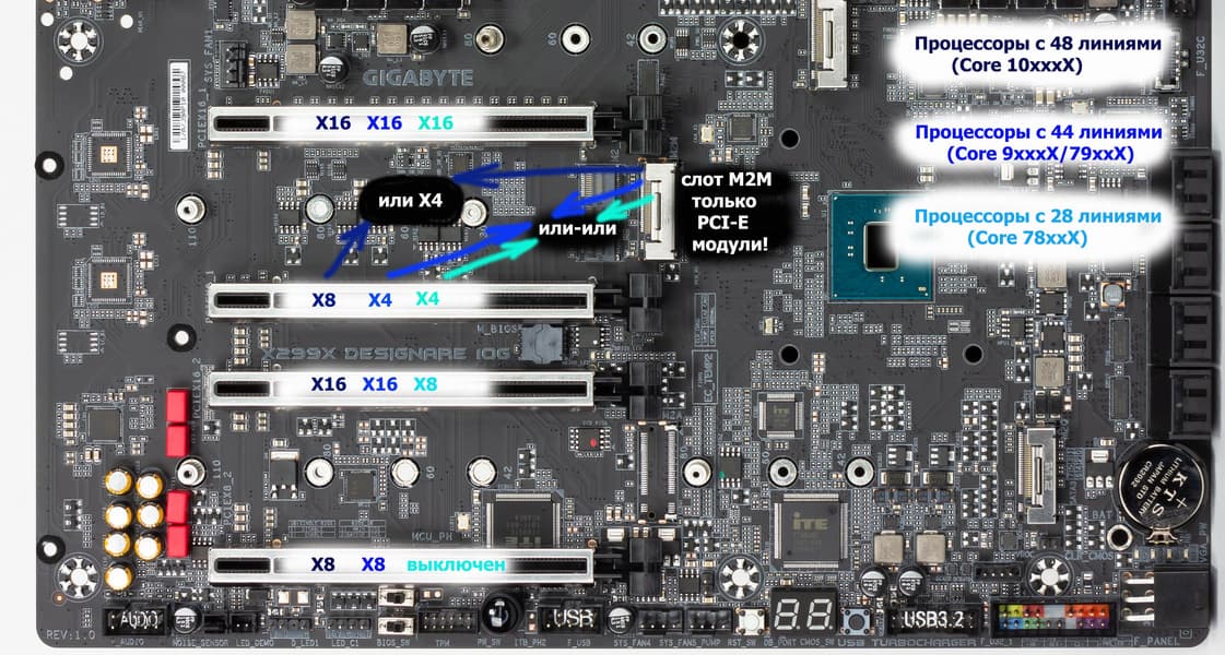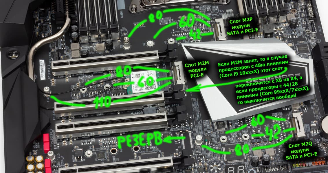 Если у нас процессор серии Core X 7-го или 9-го поколений, то второй слот PCI-Ex16 работает только при условии если М2М не занят накопителем (и тогда имеет режим х4). То есть или модуль в М2М, или второй слот PCI-Ex16.