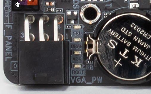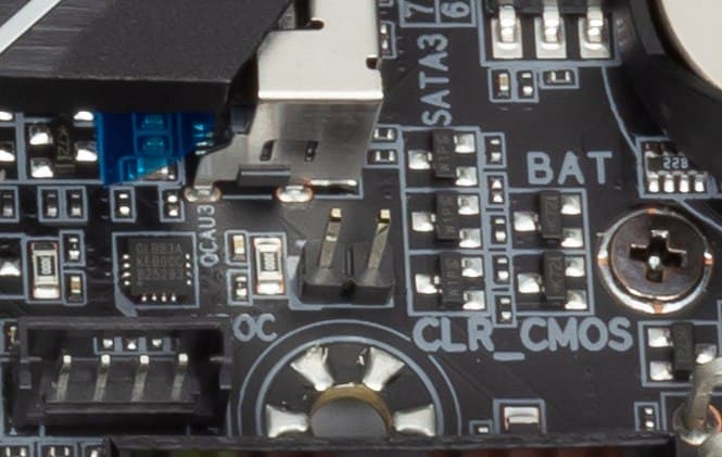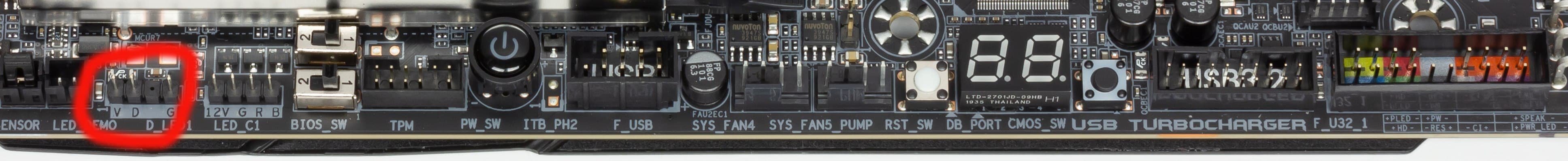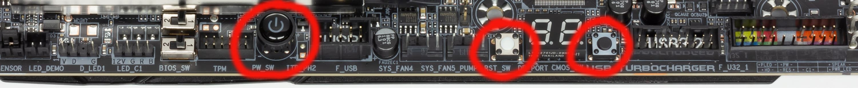 Очень удобными являются кнопки перезагрузки компьютера Reset (посредине) и включения Power (слева). Все тестеры очень благодарят производителей плат за подобные кнопки. Если вдруг случился сбой из-за неверно выставленных параметров работы материнской платы, то для сброса настроек CMOS также имеется физическая кнопка (справа). Ее дублирует традиционная перемычка для тех же целей.
