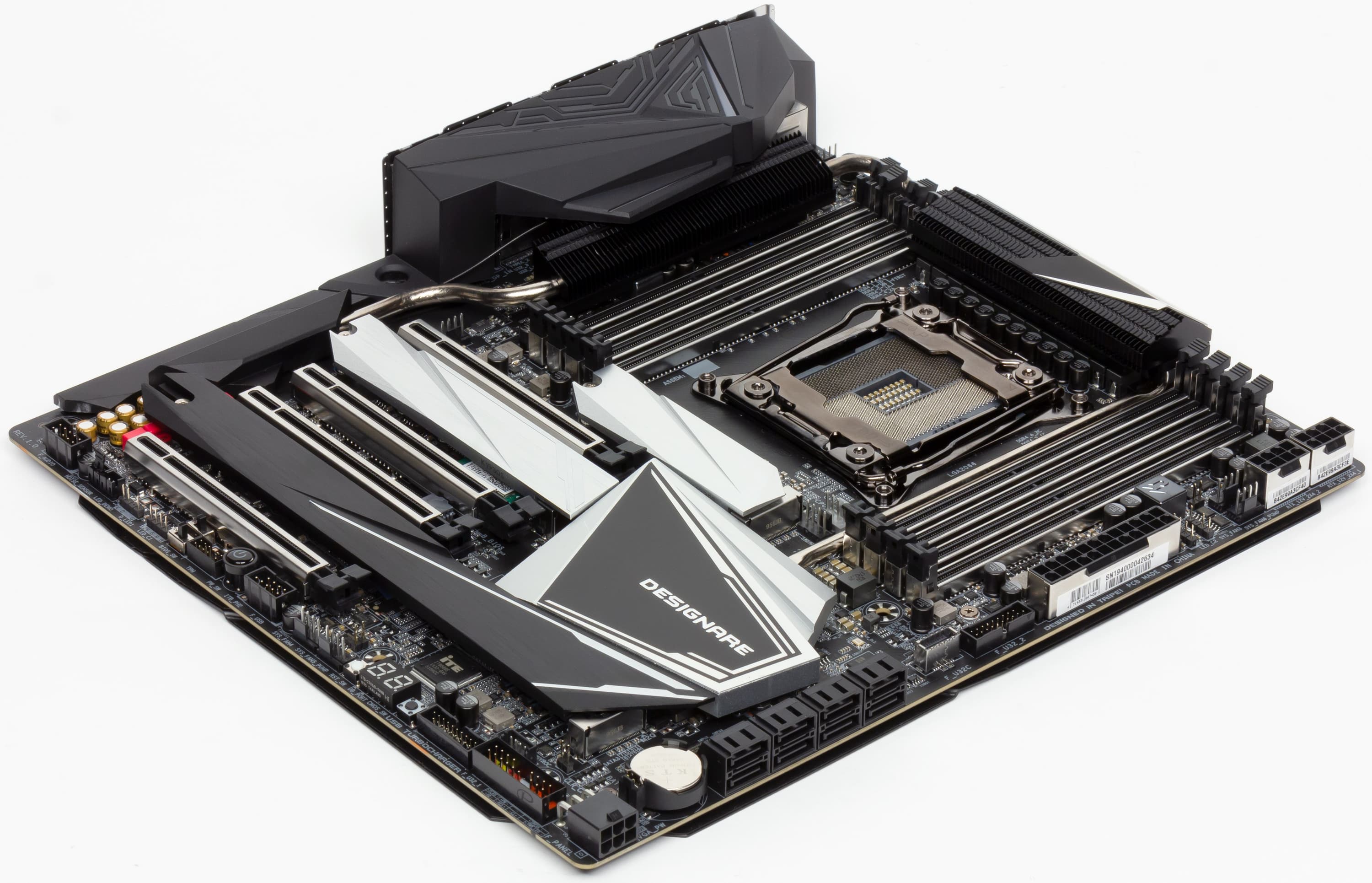 И вот, в этой серии появилась новинка: Gigabyte X299X Designare 10G. Что такое Х299Х? — это просто название платы, а чипсет — все тот же Intel X299, предназначенный для премиальной когорты ПК — HEDT (Hi End DeskTop). Здесь следует отметить, что когда-то под литерой «Х» у Intel (а потом и у AMD) выходили просто самые топовые системные чипсеты для ПК (Х58/79/99.). Как и с подобным суффиксом выходили и самые производительные и дорогие процессоры типа Core i7-9хх-59ххX. Затем в какой-то момент в «интеловском» сегменте случилось разделение: материнские платы и чипсеты с «Х» стали относить к особому сегменту высокопроизводительных решений, отделив от игровых, отдав последним литеру «Z». Как и процессоры наследники 7960X стали именоваться Core Extreme (или Core X), работающие именно совместно с чипсетами «на Х» (у них и свой socket есть, чтобы никто не мог ошибиться). И таким образом появились топовые продукты уже на Z-серии (Z170, Z370, Z390), и для них Core i9-серия ( тоже топовые процессоры, но для более широкого круга потребителей, в основном геймеров-энтузиастов), которые изначально получили значительно меньшую стоимость (мы помним, что много лет Intel ставил начальную стоимость на самые топовые Core-процессоры в виде 999 USD, теперь же Core i9-9900K изначально имел рекомендованную стоимость 599-649 USD, а Core i9-99xxX варианты получили цены в разы выше). Разница между Core и Core X — не только в количестве ядер, но и разное число PCI-E-линий, объем кешей.