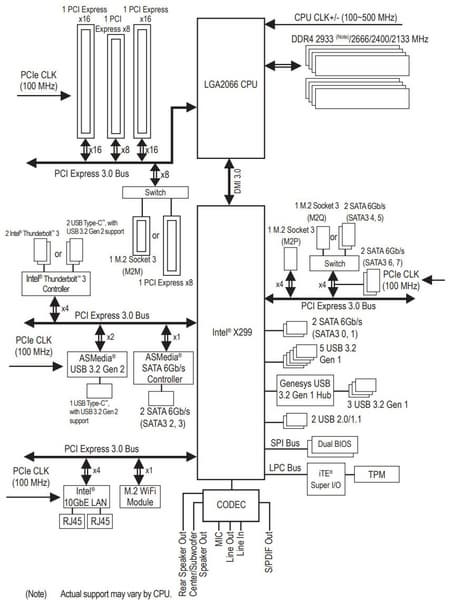 В свою очередь чипсет X299 поддерживает в сумме 30 линий ввода/вывода, которые могут конфигурироваться в порты USB, SATA, PCI-E. При этом должно быть не более 14 портов USB, из которых может быть до 10 портов USB 3.2 Gen1 (Gen2 не поддерживается), и/или до 14 портов USB 2.0. Поддерживается также до 8 портов SATA и до 24 портов PCI-E 3.0.
