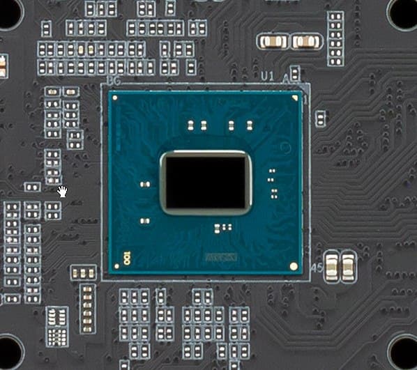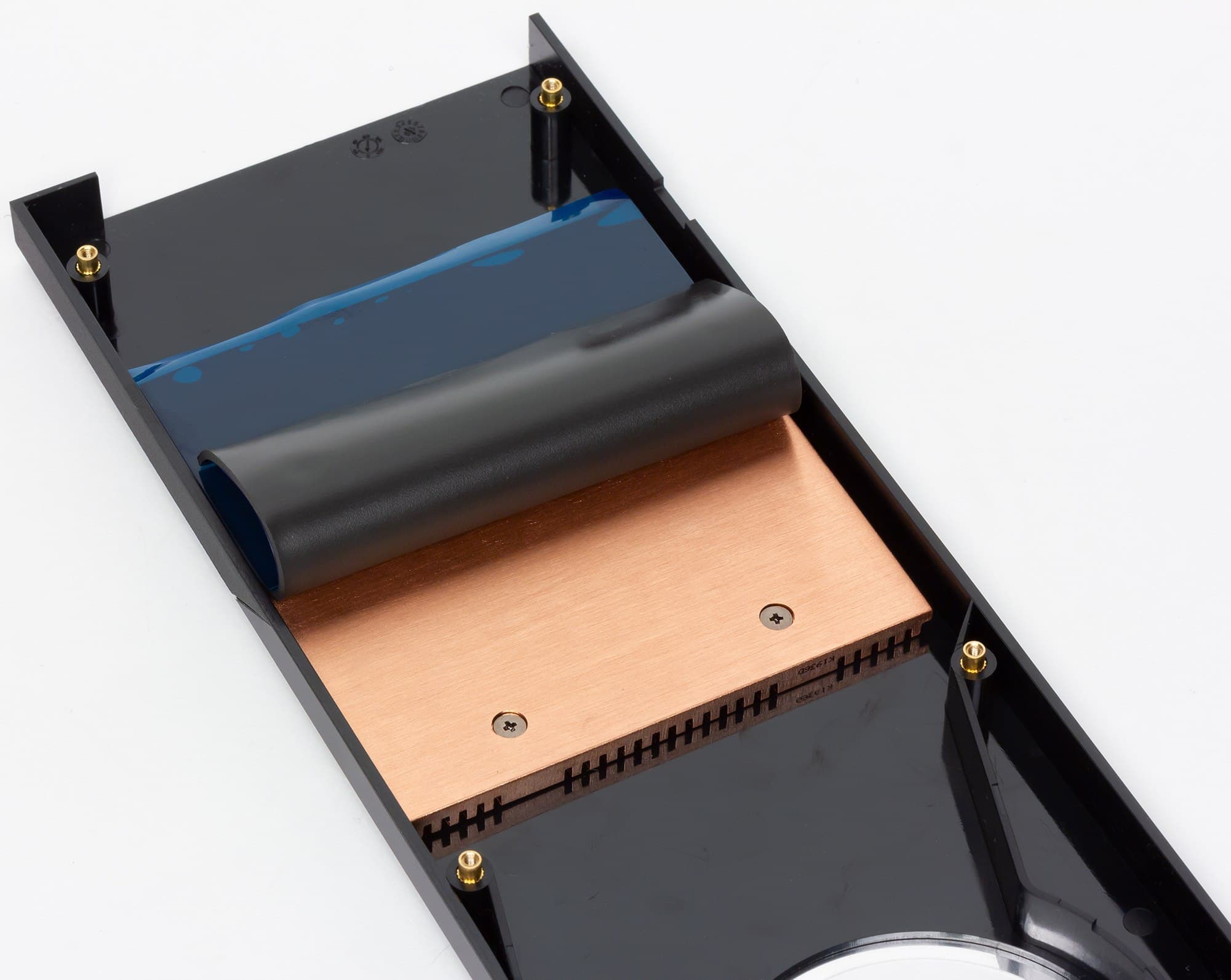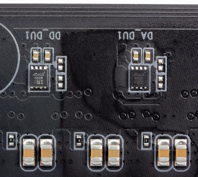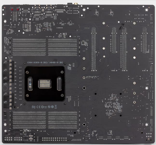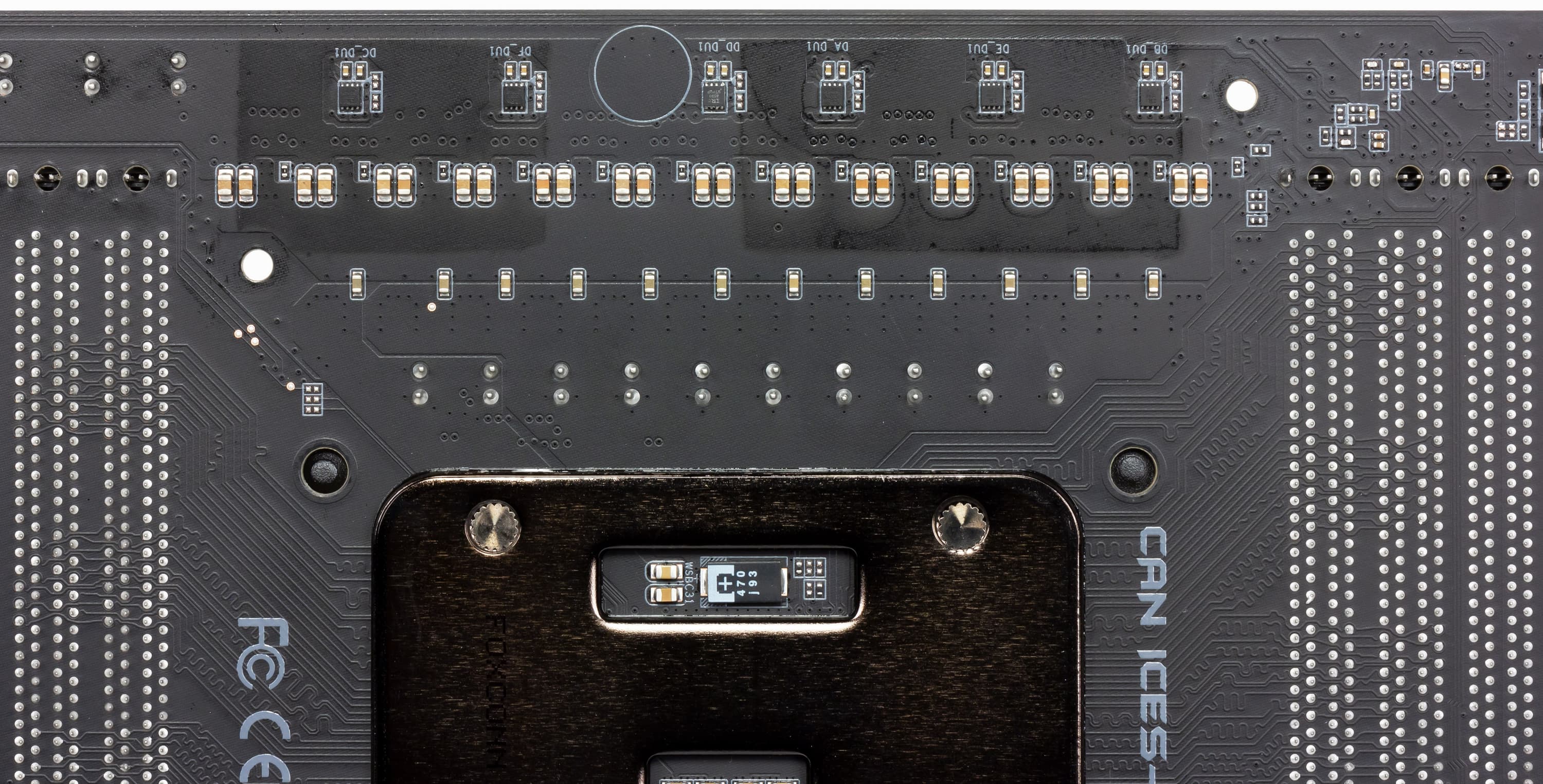 На оборотной стороне элементов мало, однако там присутствуют удвоители фаз питания и иная мелкая логика. Обработан текстолит хорошо: во всех точках пайки острые концы срезаны и обработаны. С той же стороны установлена пластина из алюминия с нанокарбоновым покрытием, которое нужно для предотвращения замыкания электроконтактов на PCB. Также пластина помогает отводить тепло от задней стороны PCB через термоинтерфейс и обеспечивает жесткость материнской платы.