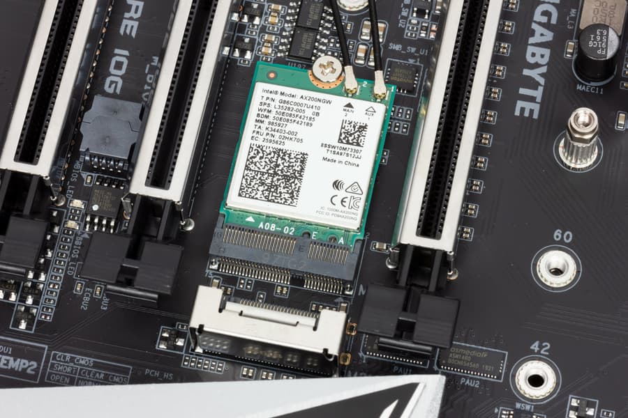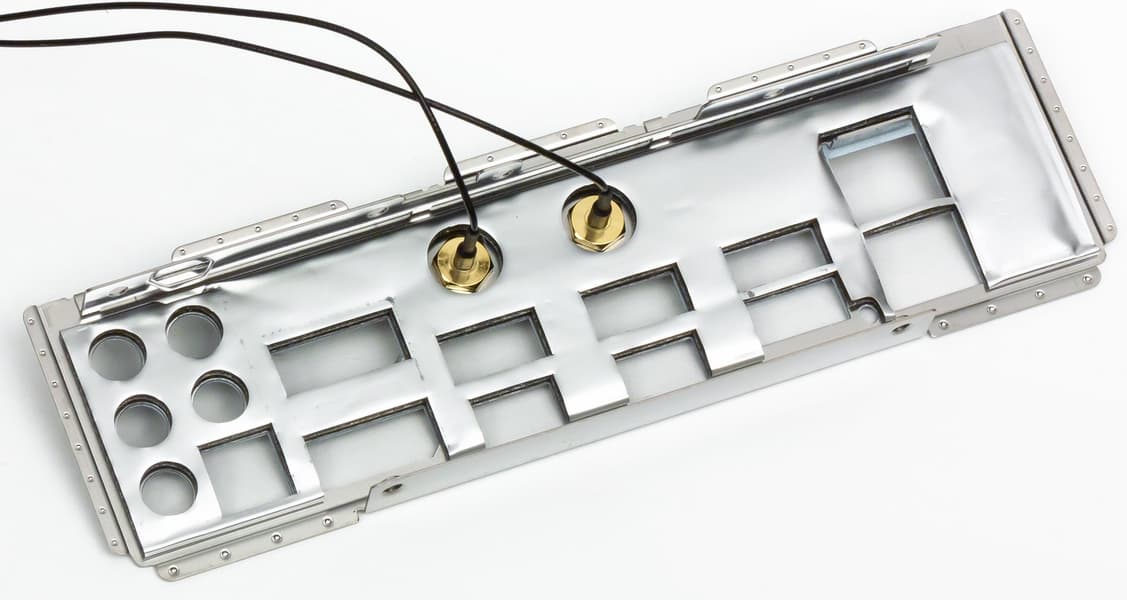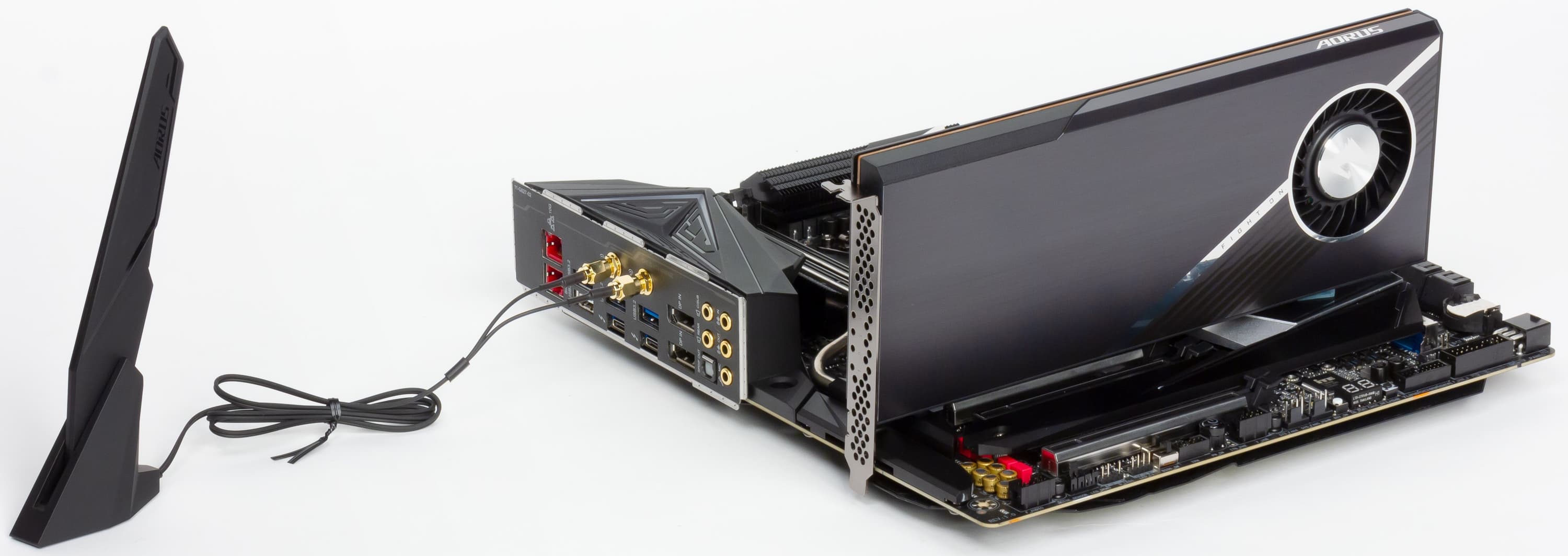 Имеется и комплексный беспроводной адаптер на контроллере Intel AX-200NGW, через который реализованы Wi-Fi 6 (802.11a/b/g/n/ac/ax) и Bluetooth 5.0. Он установлен в слот M.2 (E-key), и его разъемы для привинчивания выносных антенн выведены на заднюю панель.