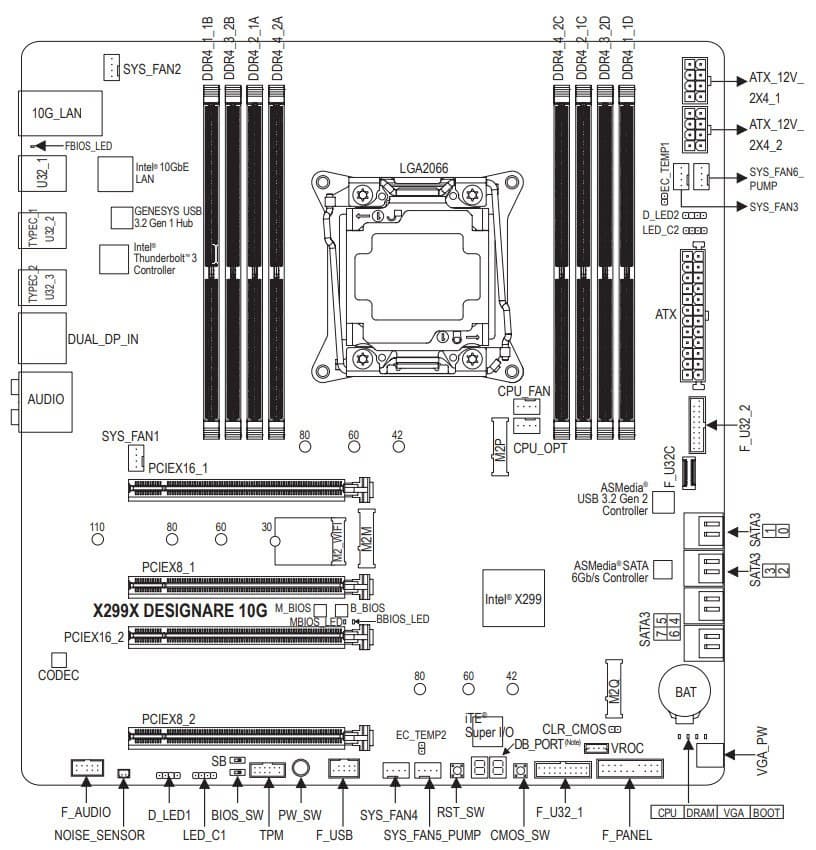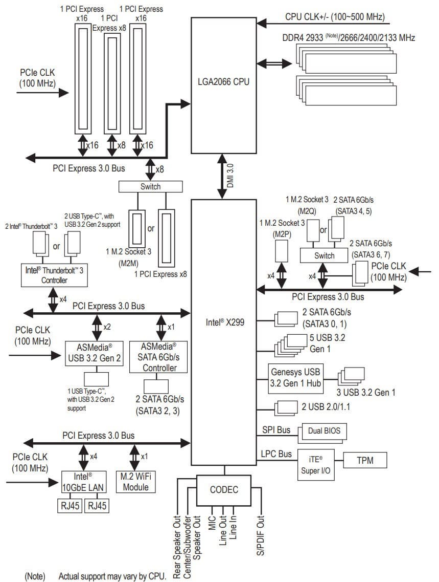 Процессоры Intel Core i9-7xxxX/9xxxX/10xxxX (совместимые с сокетом LGA2066 и поддерживаемые Х299), не имеют USB портов, 28 (Core 78xxX) или 44 (Core 79xxX/99xxX) или 48 (Core 10xxxX) линий ввода-вывода (включая PCI-E 3.0), при этом взаимодействие с X299 идет по особому каналу Digital Media Interface 3.0 (DMI 3.0), и линии PCI-E на это не расходуются. Все PCI-E линии процессора идут исключительно на слоты расширения PCI-E. Поэтому в системах такого рода можно легко встретить два слота PCI-Ex16, получаемые по 16 линий (что опять-таки, можно встретить только в системах уровня AMD Ryzen Threadripper) и еще пару PCI-Ex16, получаемые по 8 линий. Поддержки портов USB/SATA у процессоров Intel нет.