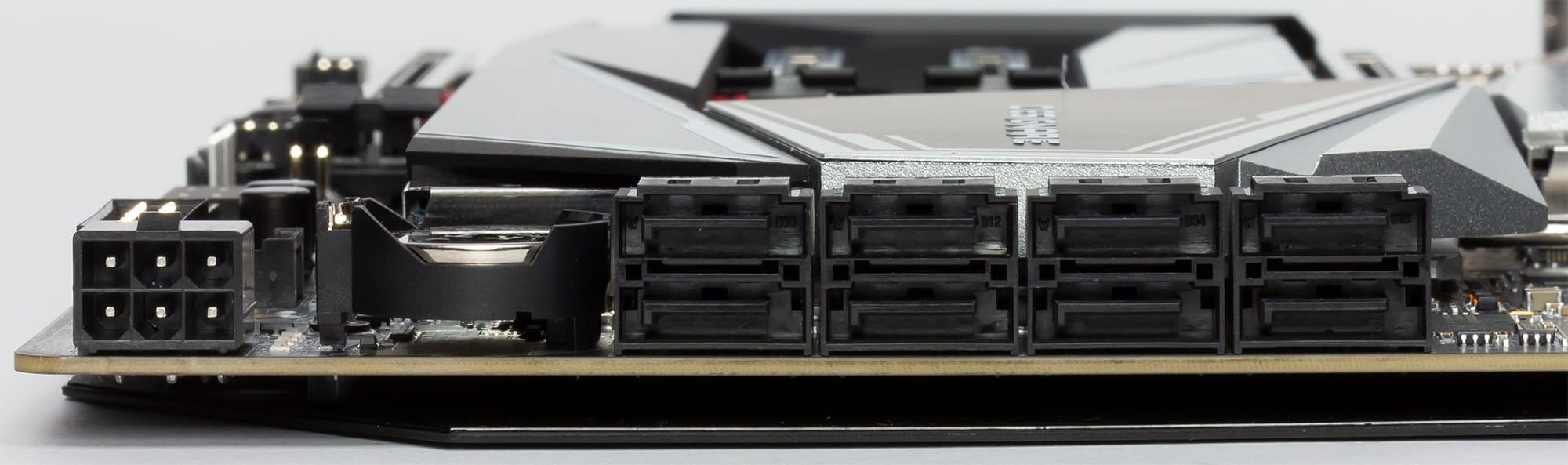 Всего у платы 8 разъемов Serial ATA 6 Гбит/с + 3 слота для накопителей в форм-факторе M.2. (Еще один слот M.2 расположен под средним слотом М2М и занят контроллером беспроводных сетей Wi-Fi/Bluetooth.). Несмотря на то, что чипсет X299 поддерживает до 8 портов SATA, реализованы через него только 6 портов SATA.