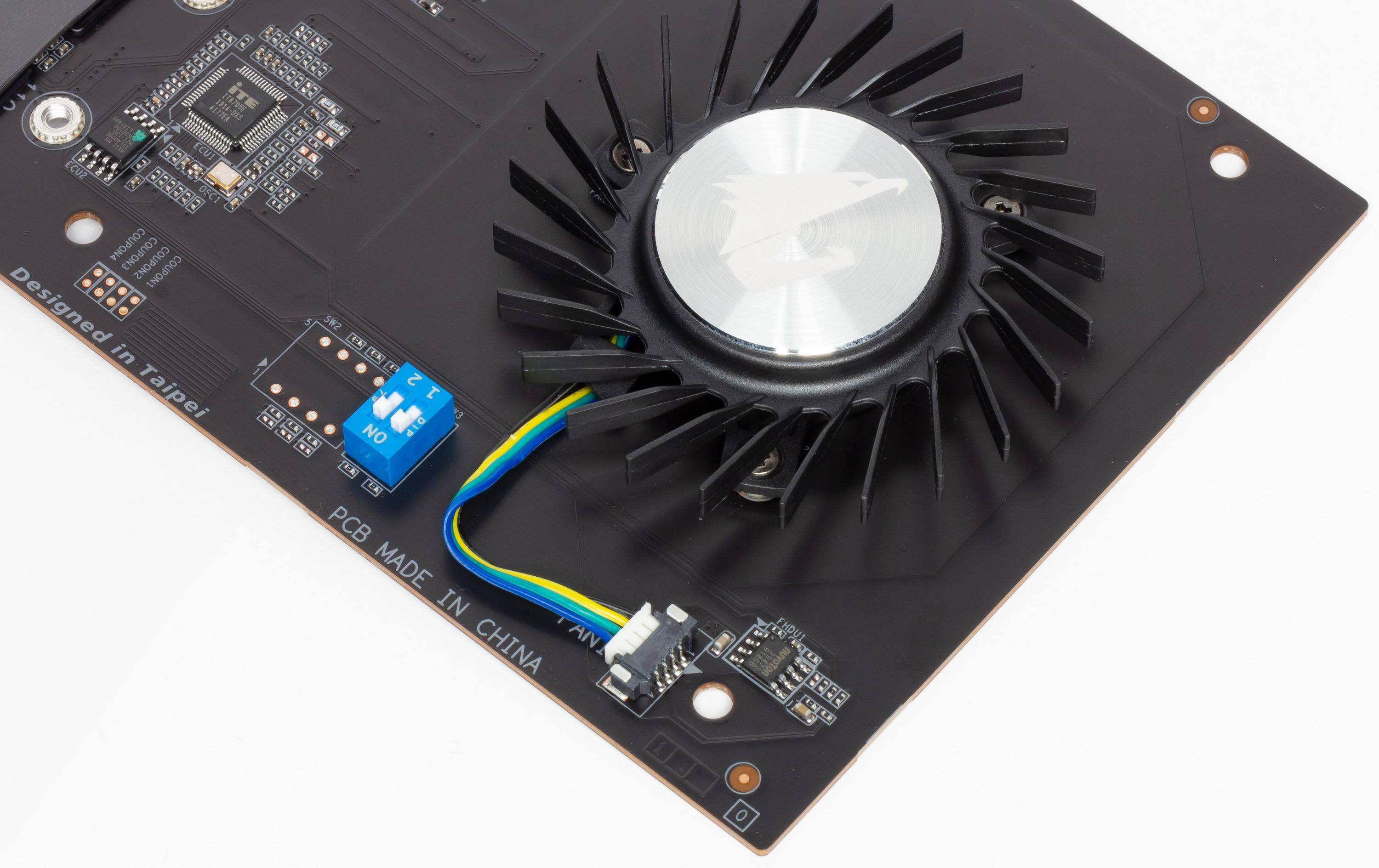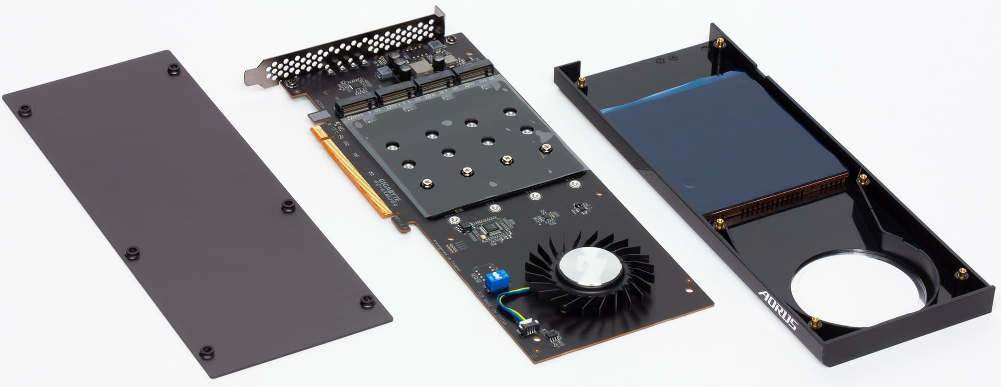 Но это не все. Я рассказал лишь о трех слотах M.2 на самой материнке, но в комплект поставки входит специальная карта Aorus Gen4 AIC.