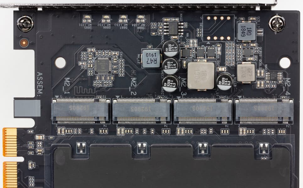 Поэтому с материнской платой поставляется особая карта (она уже поддерживает интерфейс PCI-E 4.0, но в данном случае будет работать в версии 3.0), способная вместить на себе аж 4 модуля форм-фактора M.2.