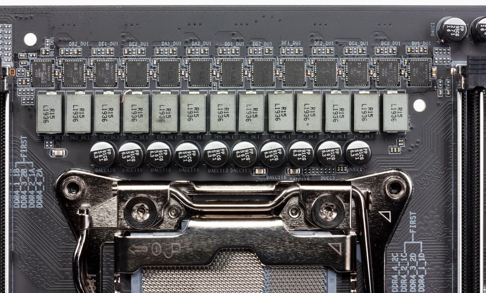Схема питания в целом имеет 13 фаз. Как мы знаем, наличие SoC — это все же пока прерогатива процессоров от AMD, у Intel чиплетных техник на десктопном сегменте пока нет. Опять же, если мы говорим про обычные процессоры, то почти все они (которые без суффикса F) имеют встроенную графику, а значит обычно часть фаз питания приходится на iGPU (встроенное графическое ядро). Однако это все не наш случай, и у HEDT процессоров нет встроенной графики. Неужели такая тонкая схема для Vcore и обвязки? Честно ли тут 13 фаз? Давайте разбираться.