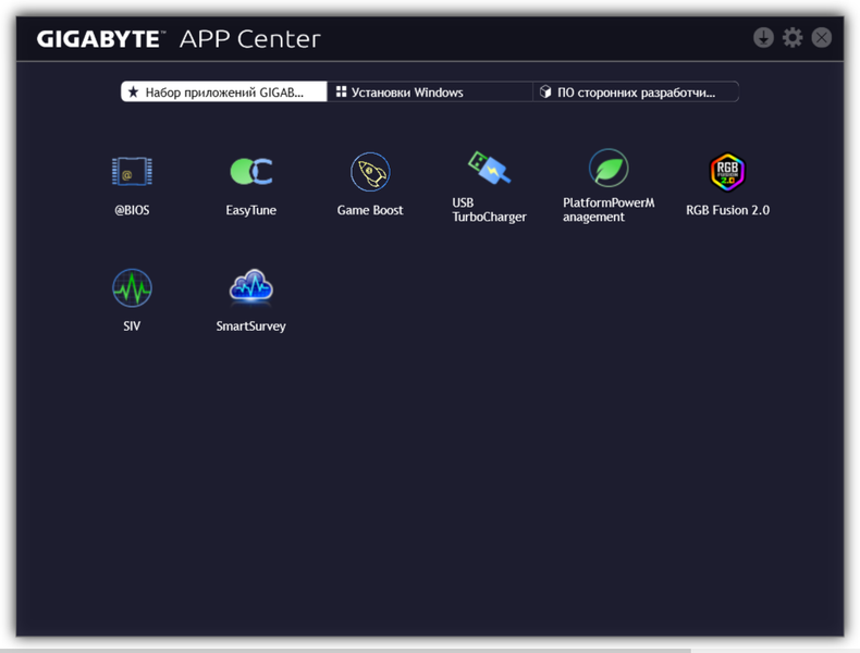 App Center помогает загрузить все остальные нужные (и не совсем нужные) утилиты. Большинство из них запускается только из App Center. Эта же программа следит и за обновлениями установленного фирменного ПО от Gigabyte, а также за актуальностью прошивки BIOS.