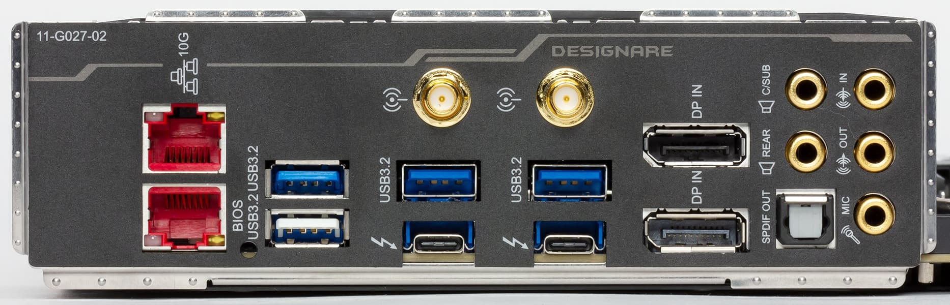 | Разъемы на задней панели | 2 × USB 3.2 Gen2 (Type-C) 4 × USB 3.2 Gen1 (Type-A) 2 × RJ-45 5 аудиоразъемов типа миниджек 1 × S/PDIF (оптический, выход) 2 антенных разъема 2 × Display Port |