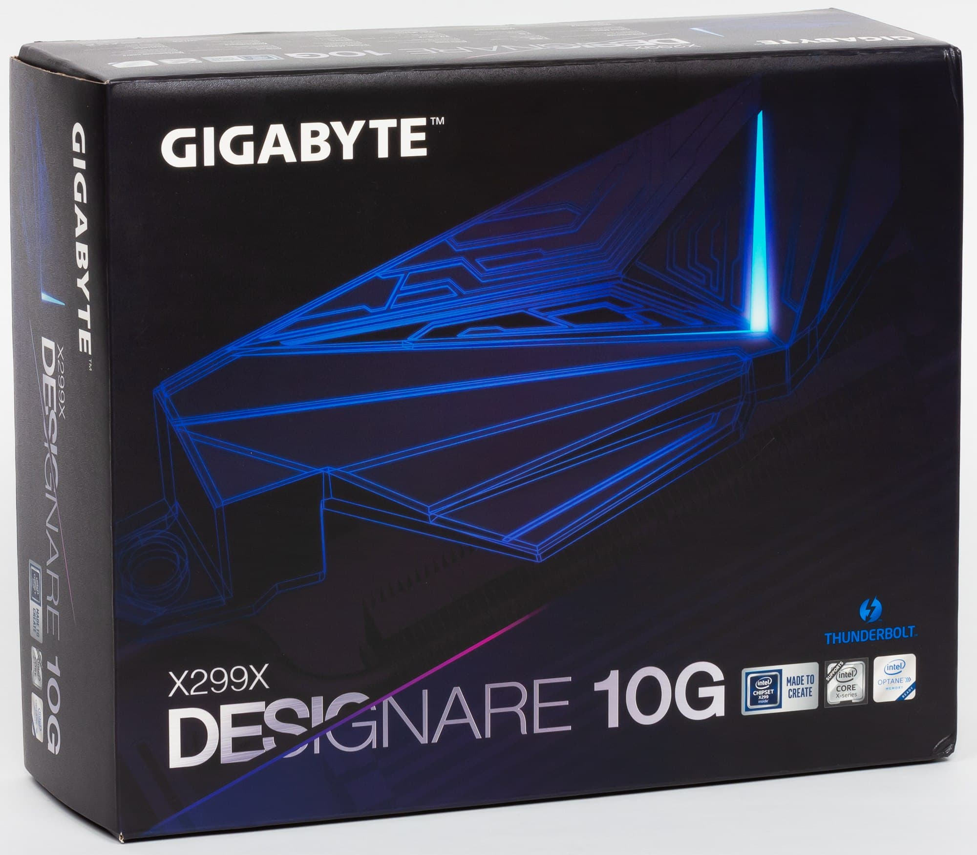 Gigabyte X299X Designare 10G поставляется в огромной и толстой коробке с характерным для серии Designare дизайном. Напомню, что данная серия идет под брендом Gigabyte, а не Aorus.