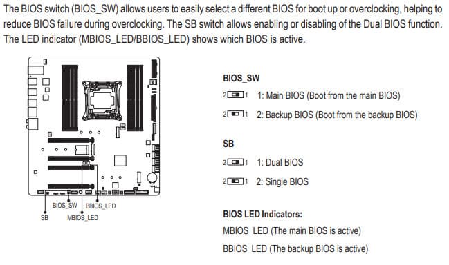 По умолчанию режим работы — Dual BIOS и загрузка с основной микросхемы. Если надо выключить двойной BIOS (то есть, чтобы система «не видела» вторую копию), то SB переключить в Single BIOS. Через BIOS_SW выбираем — с какой версии загружаться.