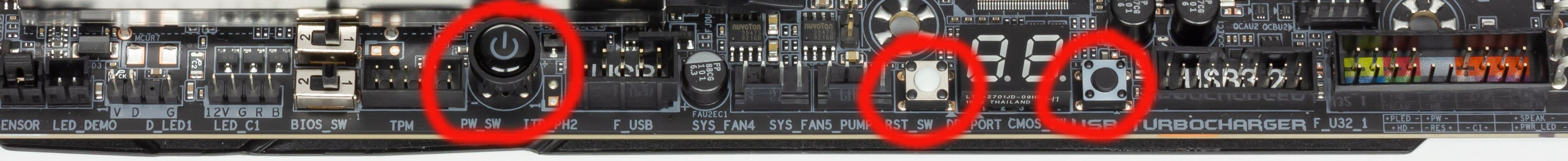 Теперь о «фенечках», то есть «прибамбасах». Несмотря на особое позиционирование данной линейке, всяких изюминок на материнке предостаточно. Взять хотя бы традиционные кнопки.