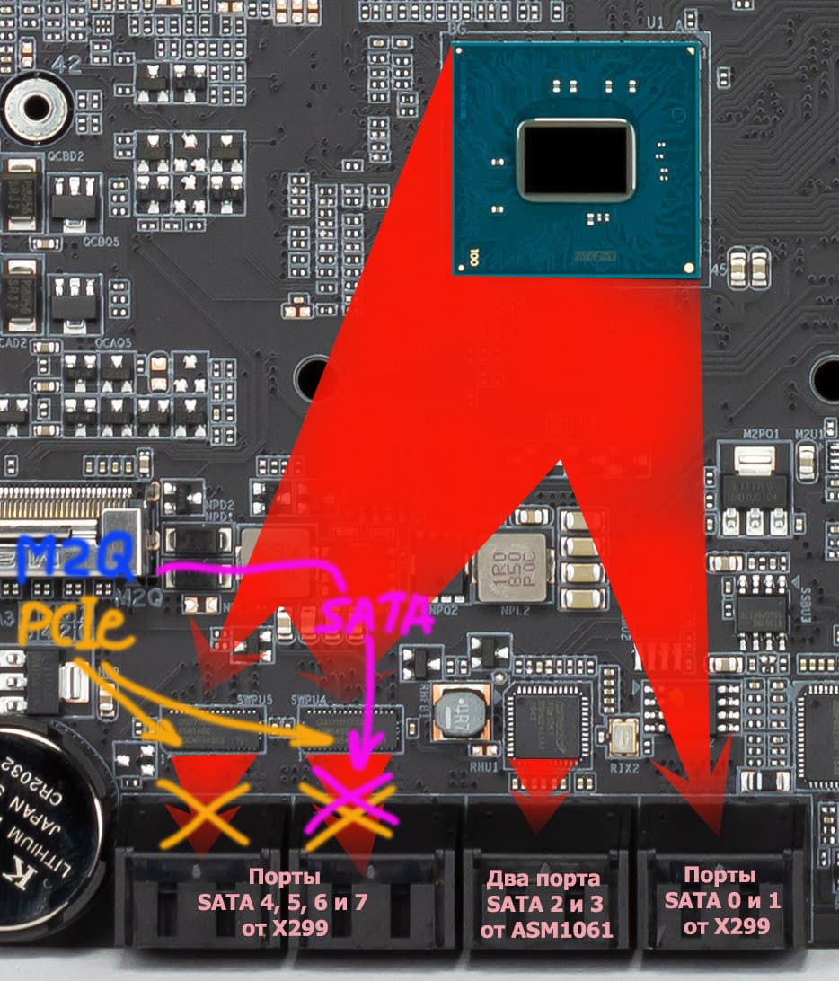 Средний слот М2М вынужден делить ресурсы со вторым слотом PCI-Ex16 (который реально х8), собственно я про это выше уже писал. Нижний слот M2Q делит ресурсы с некоторыми SATA портами — я уже писал тоже. Ну и помним, что именно слот М2М обслуживается процессором.
