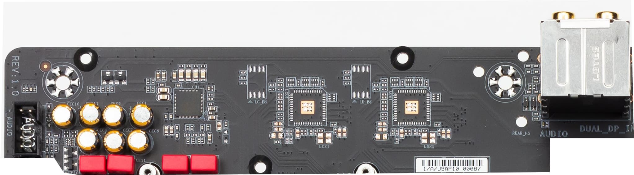 Наверное, вы обратили внимание, что данная плата имеет два DisplayPort 1.4, работающие только на вход. Сделано это именно ради реализации Thunderbolt 3: выход видеокарты соединяется со входом DP на материнке, а уже с выхода Type-C/Thunderbolt изображение передается на монитор или телевизор. Для подключения видеокарты ко входу DisplayPort на материнской плате можно использовать комплектный кабель Mini-DP—DP либо приобрести обычный кабель DisplayPort (говорят, что могут быть проблемы из-за длины кабеля, и не все подойдут). Разумеется, точно также можно подключить, например, вторую видеокарту к другому порту DP на материнке.