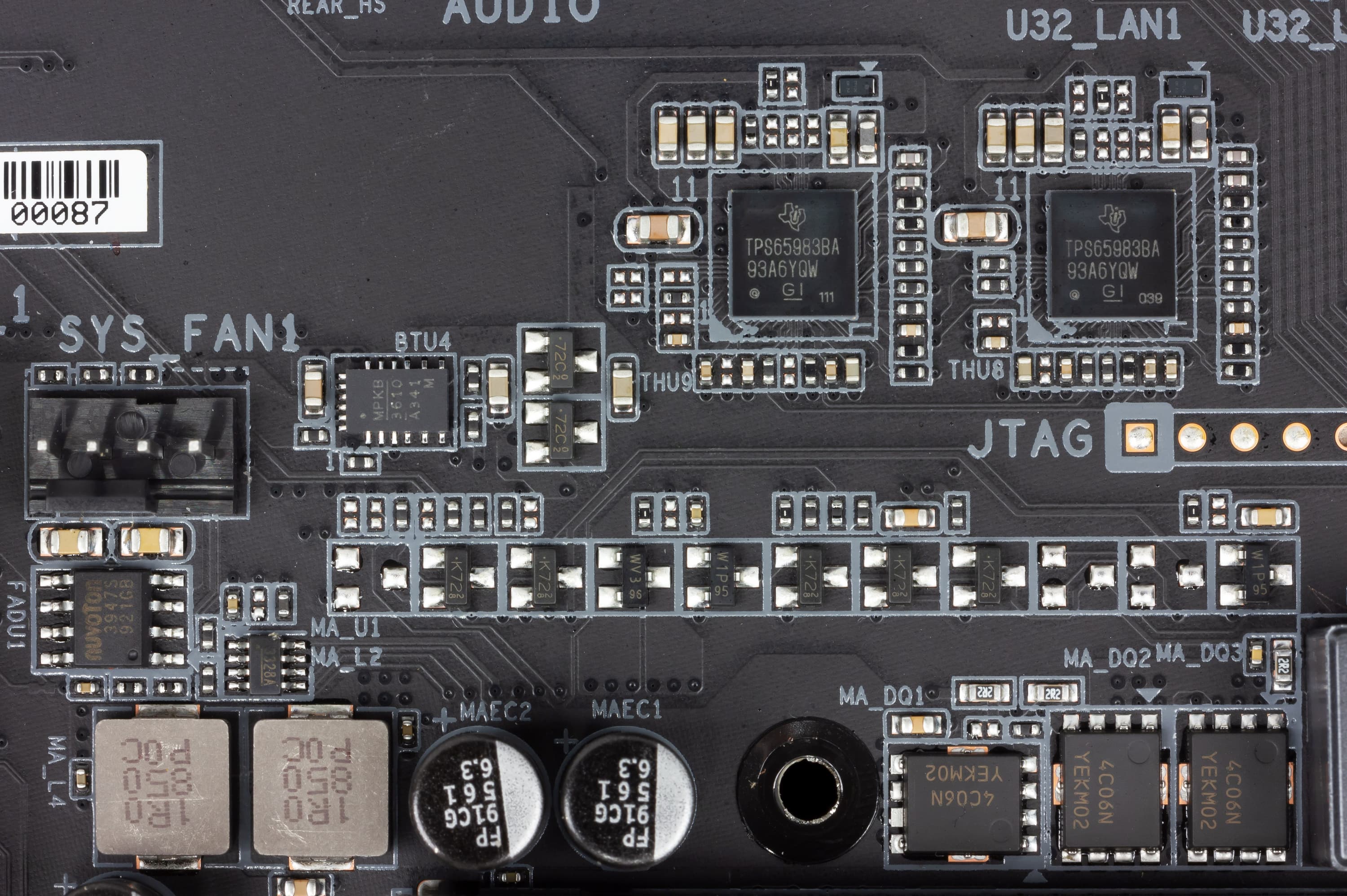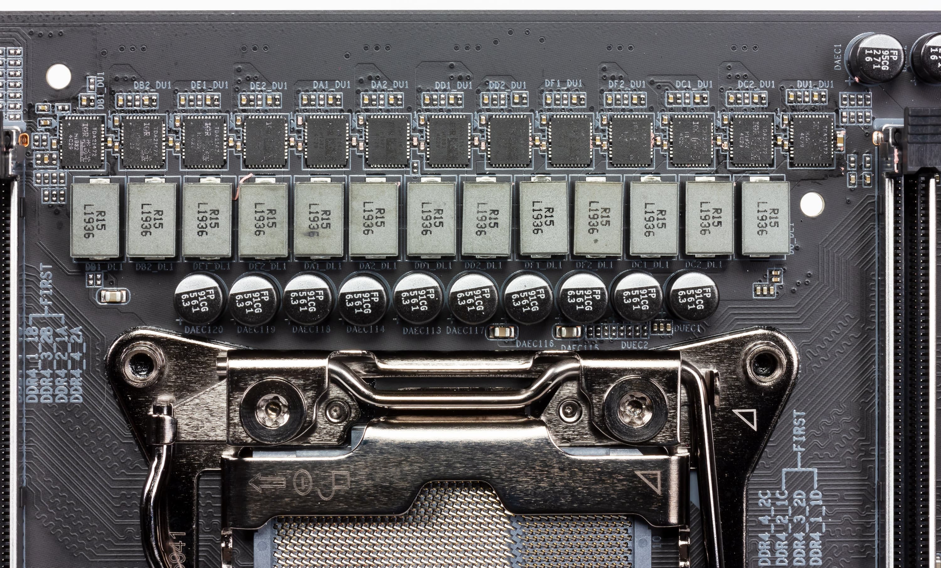 Каждый канал «псевдофазы» имеет суперферритовую катушку и MOSFET IOR TDA21472 на 70 A того же Infineon. То есть суммарно система питания способна пропустить через себя колоссальную нагрузку (хватит на 4 топовых процессора). Учитывая, что данная материнская плата не рассчитана на оверклокинг, становится понятно — почему фазы делятся, но при этом система питания очень мощна: нужна высочайшая стабильность в работе. Тонкая регулировка питания большим количеством фаз как раз больше востребована энтузиастами/оверклокерами, а в данном случае оно не требуется. Зато огромный резерв по нагрузке обеспечит стабильность и относительно невысокие температуры VRM даже при использовании совместно с самыми «прожорливыми» процессорами типа i9-10980XE.
