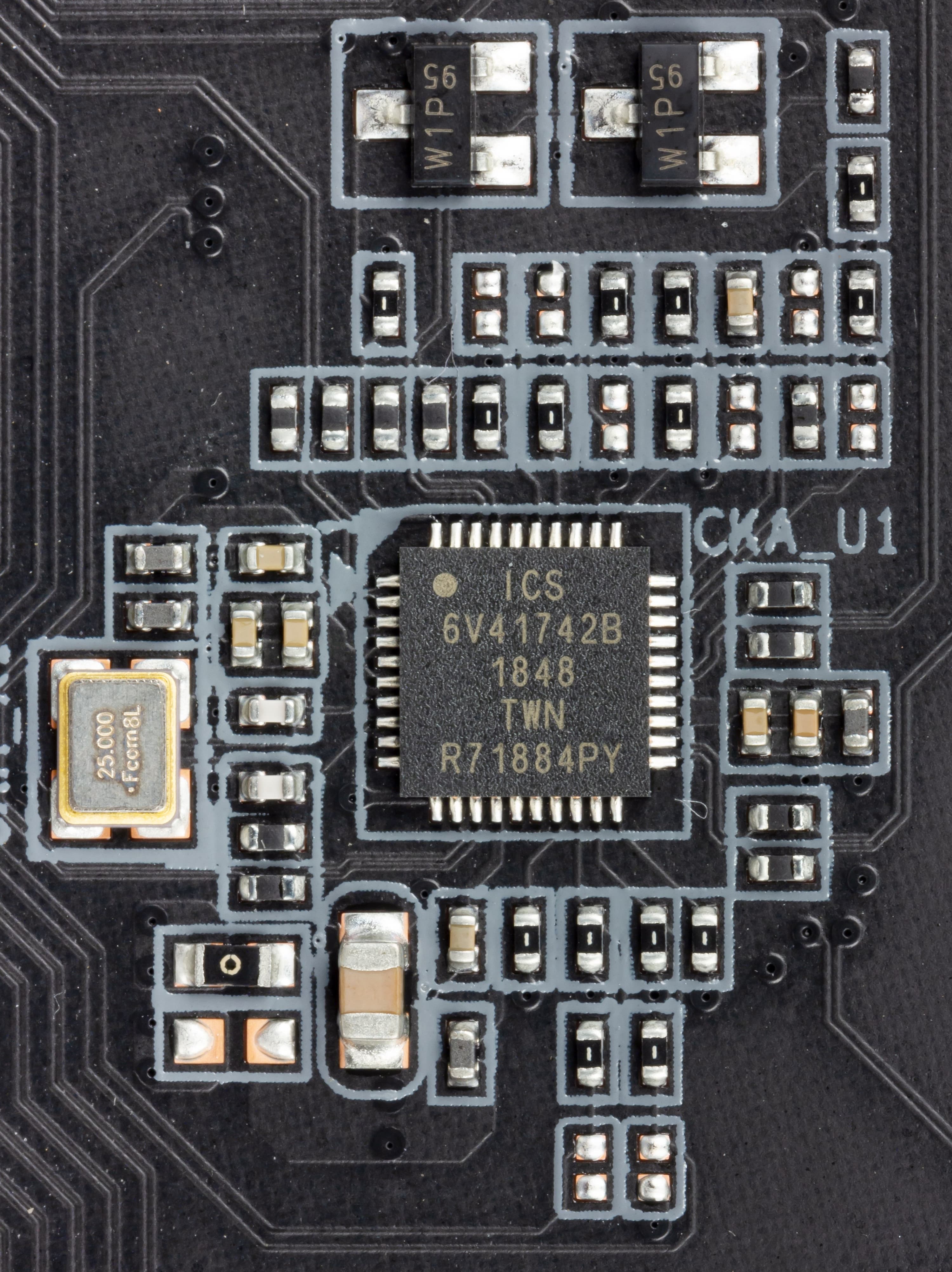 Для поддержания стабильных частот на шине PCI-E (но оверклокеры уверены, что для их нужд) имеется внешний тактовый генератор.