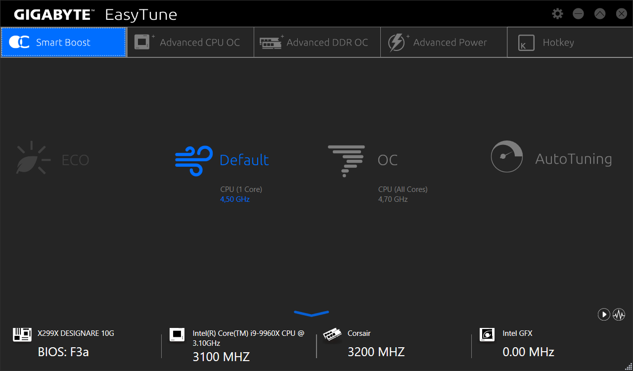 Стартовая вкладка EasyTune — это для тех, кому неохота влезать в тонкости разгона. Здесь можно просто выбрать режим, чтобы система сама выставила все частоты и напряжения. В процессорах Intel работает технология Turbo Boost, которая позволяет автоматически поднимать частоту работы ядер до определенных максимумов в пределах теплопакета и температуры конкретной модели процессора.
