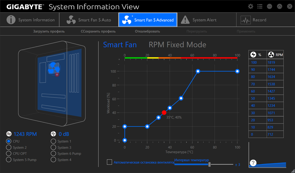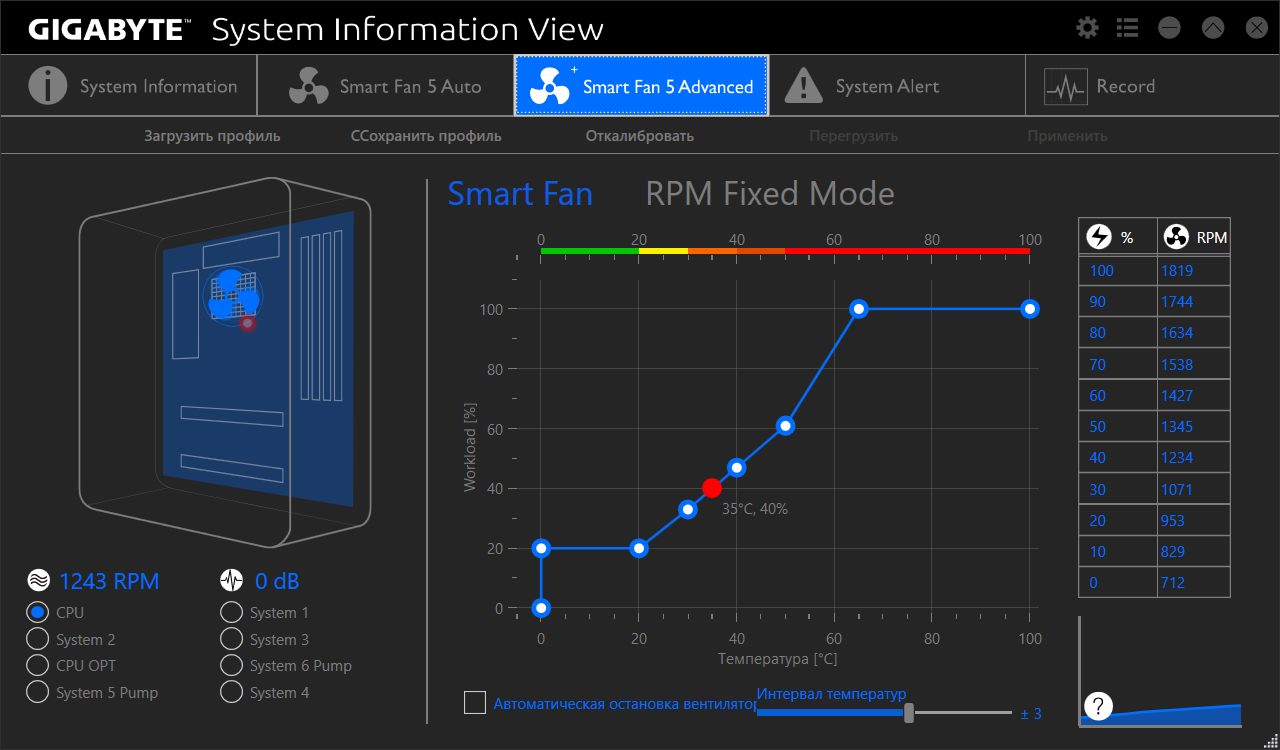 Понятно, что на этой вкладке мы выбираем режимы, исходя из шумовых характеристик. Режимы «умные», то есть если вы выбрали, например, «тихий» режим, то частота вращения вентиляторов будет поддерживаться на минимальном уровне до тех пор, пока это возможно из-за нагрева процессора/платы (мы помним, что плата оснащена массой термодатчиков), затем сформируется сигнал для снижения частот в рамках Turbo Boost.