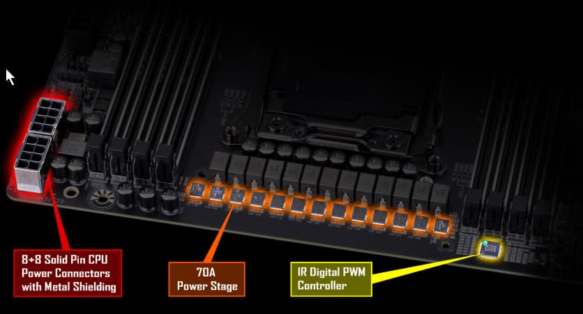 Система питания весьма внушительная (собственно и не удивительно: это материнская плата топового уровня и для HEDT процессоров, которые весьма прожорливы).